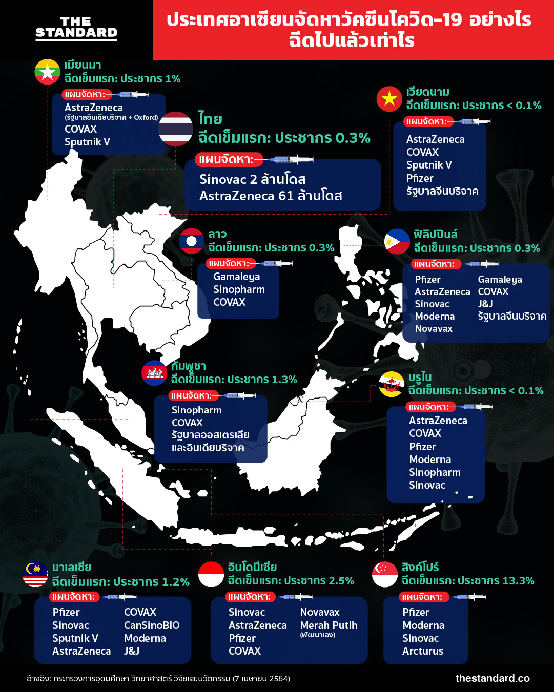 ประเด็นสำคัญของการจัดหาวัคซีนโควิด-19 มี 2 ประเด็นคือ ความหลากหลายของวัคซีนเพื่อกระจายความเสี่ยง และการกระจายวัคซีนให้ครอบคลุมเร็วที่สุด ซึ่งทั้งสองประเด็นนี้ เมื่อเหลียวมองประเทศเพื่อนบ้านในภูมิภาคอาเซียน เราพบว่า ประเทศไทยมีการกระจายความเสี่ยงในยี่ห้อวัคซีนต่ำที่สุด เพราะผูกกับ AstraZeneca มากกว่า 90% ขณะที่การกระจายฉีดก็ไม่ได้ดีแบบโดดเด่น