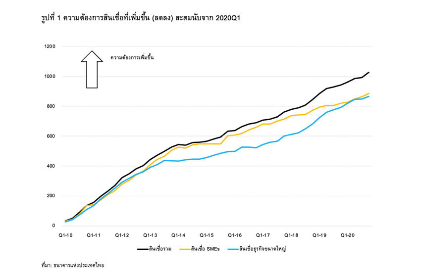 เมื่อแบ่งข้อมูลเป็นธุรกิจขนาดใหญ่และธุรกิจ SMEs จะเห็นว่าธุรกิจทั้งสองขนาดต่างมีความต้องการขอสินเชื่อเพิ่มขึ้นทั้งคู่ โดยเฉพาะ SMEs ที่มีความต้องการเพิ่มขึ้นมากในช่วงปี 2013-2019 ซึ่งเป็นการขอสินเชื่อเพื่อการลงทุนใหม่และสินเชื่อหมุนเวียน อย่างไรก็ตาม สถาบันการเงินกลับเพิ่มความเข้มงวดในการให้สินเชื่อกับ SMEs อย่างมากเมื่อเทียบกับธุรกิจขนาดใหญ่ ทำให้ความเข้มงวดสะสมในการให้สินเชื่อธุรกิจใหญ่และ SMEs ฉีกออกจากกันอย่างชัดเจน