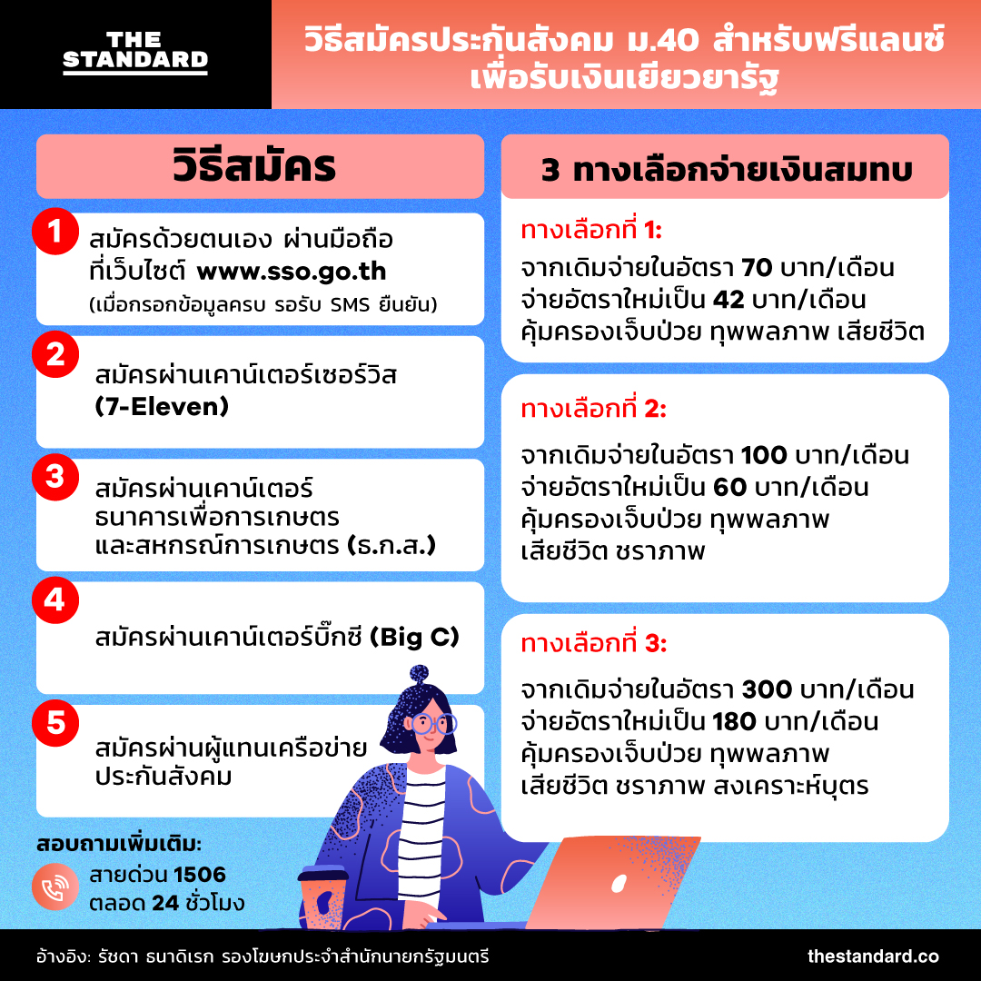 กรณีผู้ประกอบการที่ไม่มีลูกจ้าง ผู้ประกอบการในระบบ ‘ถุงเงิน’ ที่ไม่มีลูกจ้าง ผู้ประกอบอาชีพอิสระ หรือฟรีแลนซ์ ที่ยังประกอบอาชีพอยู่ หากไม่ได้อยู่ในระบบประกันสังคม ยังคงมีสิทธิ์ได้รับการเยียวยา แต่จะต้องลงทะเบียนเป็นผู้ประกันตนมาตรา 40 เสียก่อน โดยเตรียมหลักฐานยื่นลงทะเบียนภายในเดือนนี้ (กรกฎาคม 2564) เพื่อรับเงินช่วยเหลือ 5,000 บาท