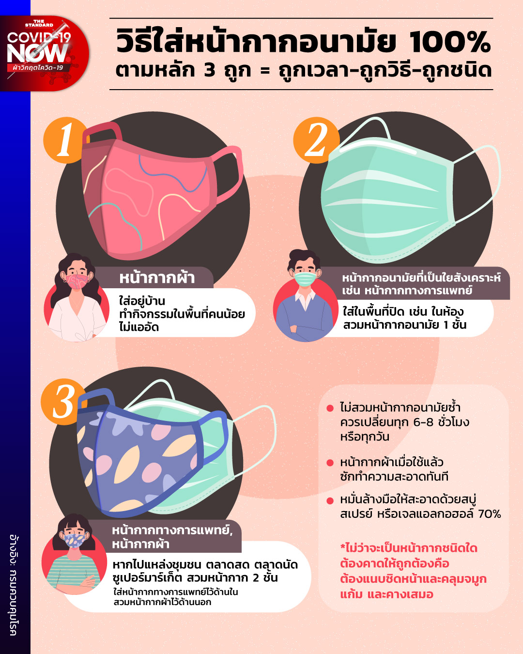นพ.โสภณ เอี่ยมศิริถาวร รองอธิบดีกรมควบคุมโรค กล่าวว่า “การใช้หน้ากากอนามัยให้ได้ผลดีที่สุดคือ การใช้โดยยึดหลัก 3 ถูก คือ ถูกเวลา ถูกวิธี และถูกชนิด ซึ่งที่ผ่านมาได้รับความร่วมมือจากประชาชนเป็นอย่างดี และในสถานการณ์ที่โรคกำลังแพร่ระบาดถึงคนในครอบครัว ขณะนี้ขอให้เพิ่มความความระมัดระวังและเคร่งครัดมากเป็นพิเศษ ดังนั้นจะต้องสวมหน้ากากตลอดเวลา ทั้งขณะอยู่ในบ้านและนอกบ้าน โดยหน้ากากผ้าเหมาะสำหรับทำกิจกรรมในที่ที่มีคนน้อย ไม่แออัด เช่น ในบ้าน ส่วนหน้ากากอนามัยที่เป็นใยสังเคราะห์ เช่น หน้ากากทางการแพทย์ เหมาะสำหรับใช้ในพื้นที่ปิด เช่น ในห้อง สวม 1 ชั้นก็เพียงพอ แต่หากจำเป็นต้องไปในแหล่งชุมชน มีคนพลุกพล่าน เช่น ตลาดสด ตลาดนัด ซูเปอร์มาร์เก็ต ขอให้ใส่ 2 ชั้น จะช่วยเพิ่มประสิทธิภาพให้มั่นใจว่าสามารถป้องกันเชื้อได้ดียิ่งขึ้น โดยใส่หน้ากากทางการแพทย์ไว้ด้านใน สวมหน้ากากผ้าไว้ด้านนอก และไม่ว่าจะเป็นหน้ากากชนิดใด จะต้องคาดให้ถูกต้องคือ ต้องแนบชิดหน้าและคลุมจมูก แก้ม และคางเสมอ”