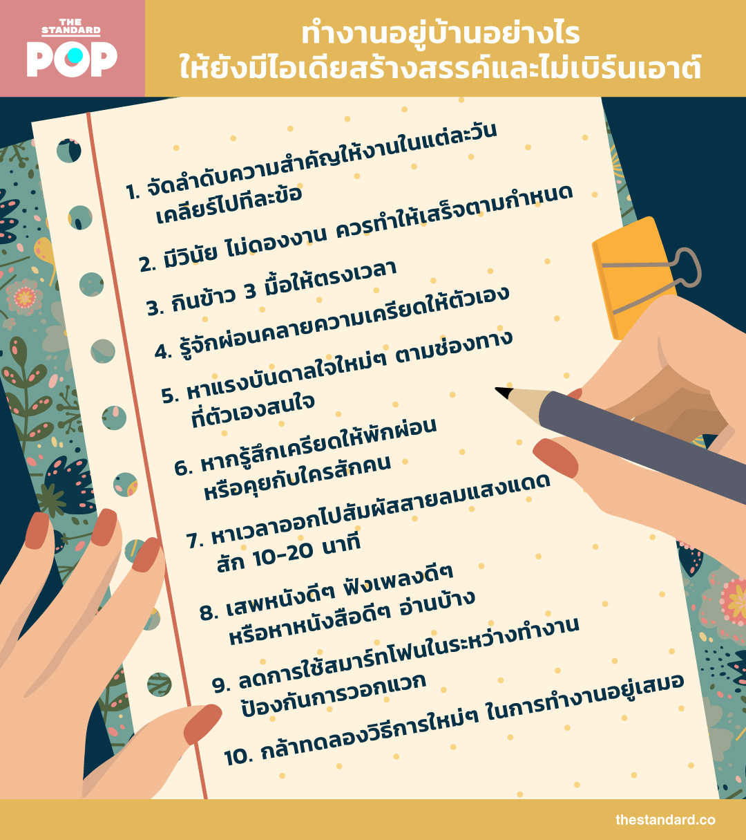 แม้จะเริ่มชินกับการต้องทำงานอยู่บ้านหรือ Work from Home ก็จริง แต่ใช่ว่าวิธีการทำงานแบบนี้จะลงตัวเสมอไป เพราะสิ่งหนึ่งที่คนทำงานไม่ควรมองข้ามคือภาวะ Burnout Syndrome หรืออาการหมดไฟในการทำงานที่อาจเกิดขึ้นได้ เมื่ออยู่ในสภาพแวดล้อมซ้ำๆ หากไม่คอยกระตุ้นตัวเอง วันใดวันหนึ่งไอเดียสร้างสรรค์ที่เคยมีอาจเดินมาถึงทางตันก็เป็นได้ THE STANDARD POP จึงคัดสรรแนวทางเพื่อปรับสมดุลให้ชีวิตเข้าที่เข้าทางและห่างไกลจากคำว่าหมดไฟในการทำงานด้วยวิธีต่อไปนี้