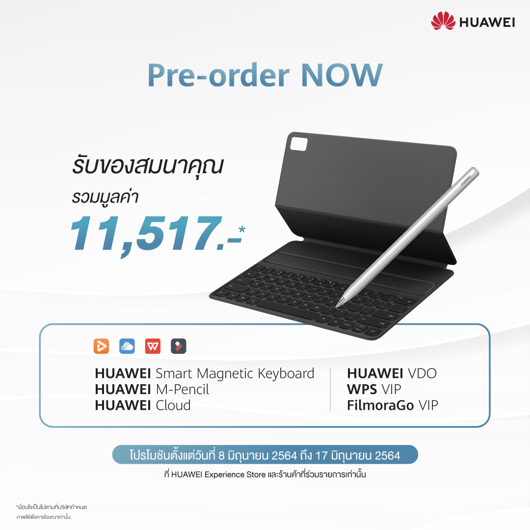 เมื่อพรีออร์เดอร์ HUAWEI MatePad Pro 12.6-inch สีเทาด้าน Matte Grey ก่อนใคร ในราคา 28,990 บาท ตั้งแต่วันที่ 8 มิถุนายน 2564 ถึง 17 มิถุนายน 2564 รับทันที Huawei Smart Magnetic Keyboard, Huawei M-Pencil, Huawei Cloud, Huawei VDO, WPS VIP และ FilmoraGo VIP