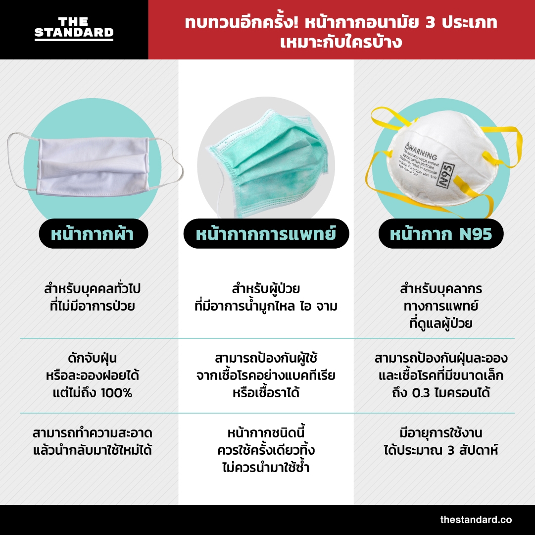 THE STANDARD ชวนผู้อ่านทำความเข้าใจเกี่ยวกับหน้ากากอนามัยทั้ง 3 ประเภทอีกครั้งว่าคุณสมบัติของแต่ละประเภทเป็นอย่างไรและเหมาะกับใครบ้าง