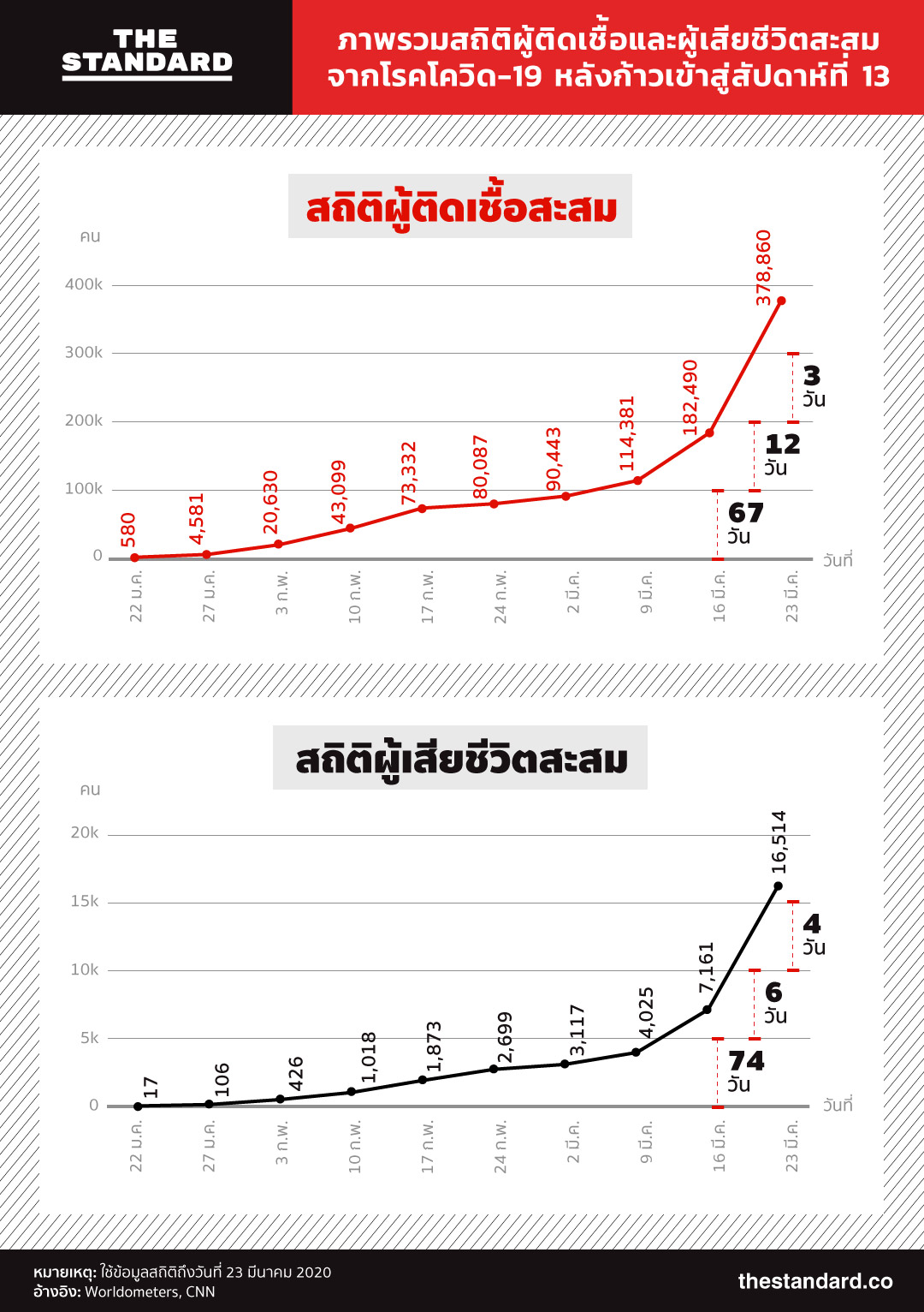 นี่คือภาพรวมของยอดผู้ติดเชื้อและผู้เสียชีวิตสะสมจากโรคโควิด-19 จำนวน 10 สัปดาห์ล่าสุด หลังการแพร่ระบาดก้าวเข้าสู่สัปดาห์ที่ 13 นับตั้งแต่มีรายงานพบผู้ติดเชื้อรายแรกอย่างเป็นทางการเมื่อวันที่ 31 ธันวาคมที่ผ่านมา โดยในระยะหลังยอดดังกล่าวเพิ่มสูงขึ้นอย่างรวดเร็ว คาดจะมีผู้ป่วยโควิด-19 สะสมทั่วโลกเกิน 4 แสนรายภายในอีกไม่กี่วันข้างหน้านี้