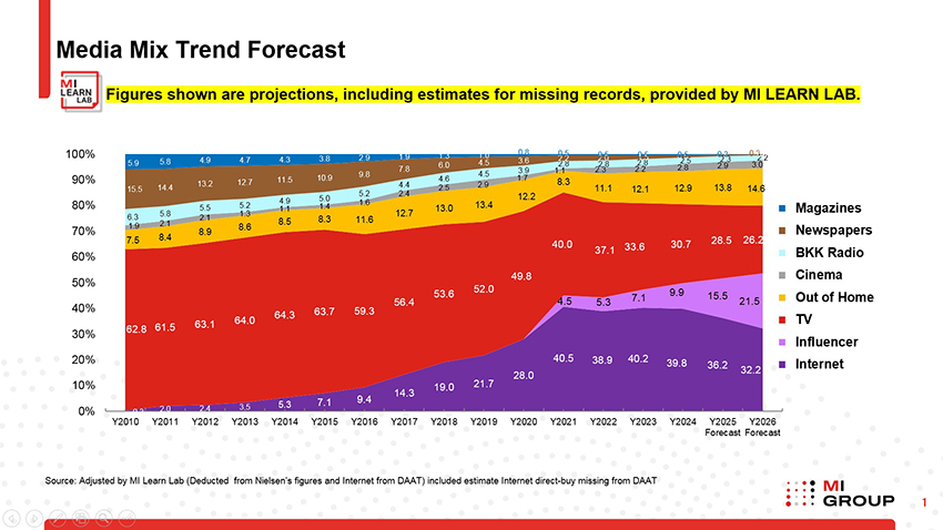 ภวัตกล่าวต่อว่า ถ้ามองภาพรวมงบโฆษณาทั้งตลาด ปีนี้ถึงปี 2569 มีแนวโน้มทรงตัว แต่ช่องทาง Digital Media ยังโตเล็กน้อยราว 5% ตามการประเมินของ DAAT ส่วนงบ Influencer Marketing กลับเติบโตแรงที่สุดในกลุ่มดิจิทัล โดยคาดว่าจะเพิ่มจาก 15.5% ของงบทั้งหมดในปีนี้ เป็นกว่า 21% ภายในปีหน้า
