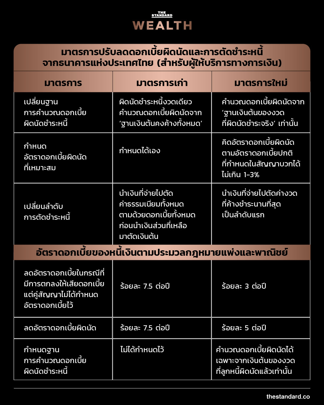 ในช่วงจังหวะที่ประเทศไทยยังอยู่ในช่วงภาวะวิกฤตโควิด ประชาชนส่วนใหญ่ได้รับผลกระทบมากมาย โดยเฉพาะการหารายได้ บางคนอาจจะสูญเสียหน้าที่การงาน ถูกลดเงินเดือน หรือสูญเสียธุรกิจไปอย่างไม่คาดคิด และก็ยังไม่มีใครคาดการณ์ได้ว่าวิกฤตครั้งนี้จะยืดเยื้อไปอีกเท่าไร ซึ่งส่งผลให้หลายคนไม่สามารถจ่ายดอกเบี้ยหนี้ประเภทต่างๆ ได้ ทางภาครัฐเล็งเห็นปัญหาดังกล่าวและได้ออกมาตรการแก้ไขหลักเกณฑ์การคิดดอกเบี้ยผิดนัดและการตัดชำระหนี้ เพื่อช่วยบรรเทาความเดือดร้อนและลดภาระให้กับประชาชนที่กำลังตกอยู่ในภาวะลำบากและไม่สามารถจ่ายชำระหนี้ได้ โดยมีมาตรการออกมา 2 ส่วน ได้แก่ มาตรการจากธนาคารแห่งประเทศไทยและการแก้ไขประมวลกฎหมายแพ่งและพาณิชย์ ดังนี้