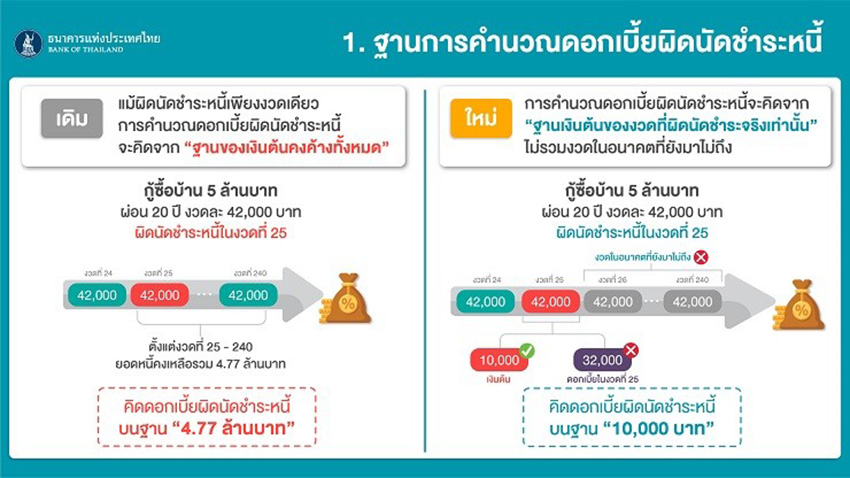 1. เปลี่ยนฐานการคำนวณดอกเบี้ยผิดนัดชำระหนี้บนฐานของ ‘เงินต้นที่ผิดนัดจริง’ เท่านั้น ไม่ให้รวมส่วนของเงินต้นของค่างวดในอนาคตที่ยังไม่ถึงกำหนดชำระ