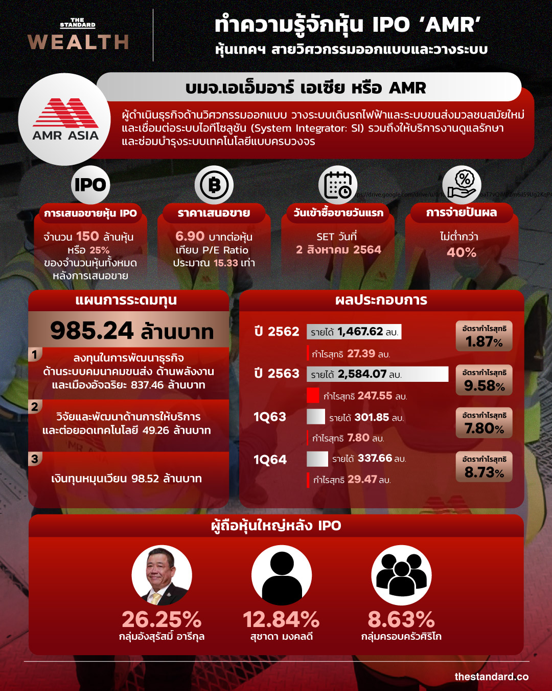 เอเอ็มอาร์ เอเซีย หรือ AMR เตรียมเข้าซื้อขายใน SET วันที่ 2 สิงหาคมนี้เป็นวันแรก ด้วยราคา IPO ที่ 6.90 บาทต่อหุ้น เงินระดมทุนจะใช้สำหรับลงทุนพัฒนาธุรกิจด้านระบบคมนาคมขนส่ง ด้านพลังงาน และเมืองอัจฉริยะ สานต่อโอกาสการเติบโตตามแผนพัฒนาโครงสร้างพื้นฐานของประเทศของภาครัฐ และการขยายการลงทุนของภาคเอกชนในหลากหลายอุตสาหกรรม