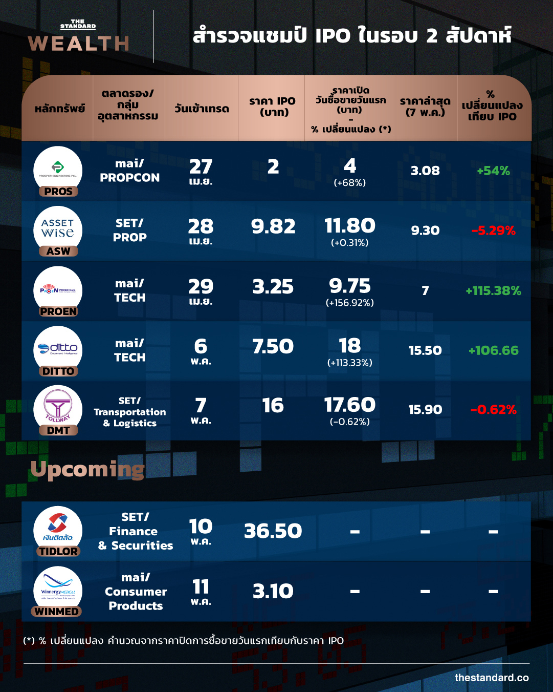 สำรวจความเคลื่อนไหวราคาหุ้น IPO ช่วง 2 สัปดาห์ พบหุ้น mai สายเทคฯ ‘PROEN-DITTO’ ราคายืนเหนือ IPO มากกว่า 100% ขณะที่ ‘DMT-ASW’ ราคาล่าสุดต่ำจอง