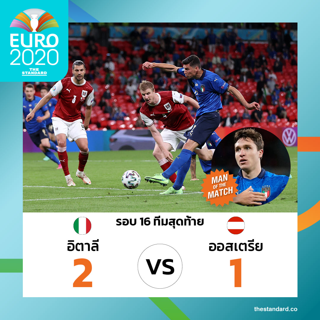 ฟุตบอลยูโร 2020 รอบ 16 ทีมสุดท้ายที่สนามเวมบลีย์ สเตเดียม ในกรุงลอนดอน เป็นเกมคู่ที่ 2 โดยอิตาลีแชมป์กลุ่ม A ที่เก็บมาได้ 9 คะแนนเต็มในรอบแบ่งกลุ่ม พบกับออสเตรีย ทีมอันดับที่ 2 ของกลุ่ม C