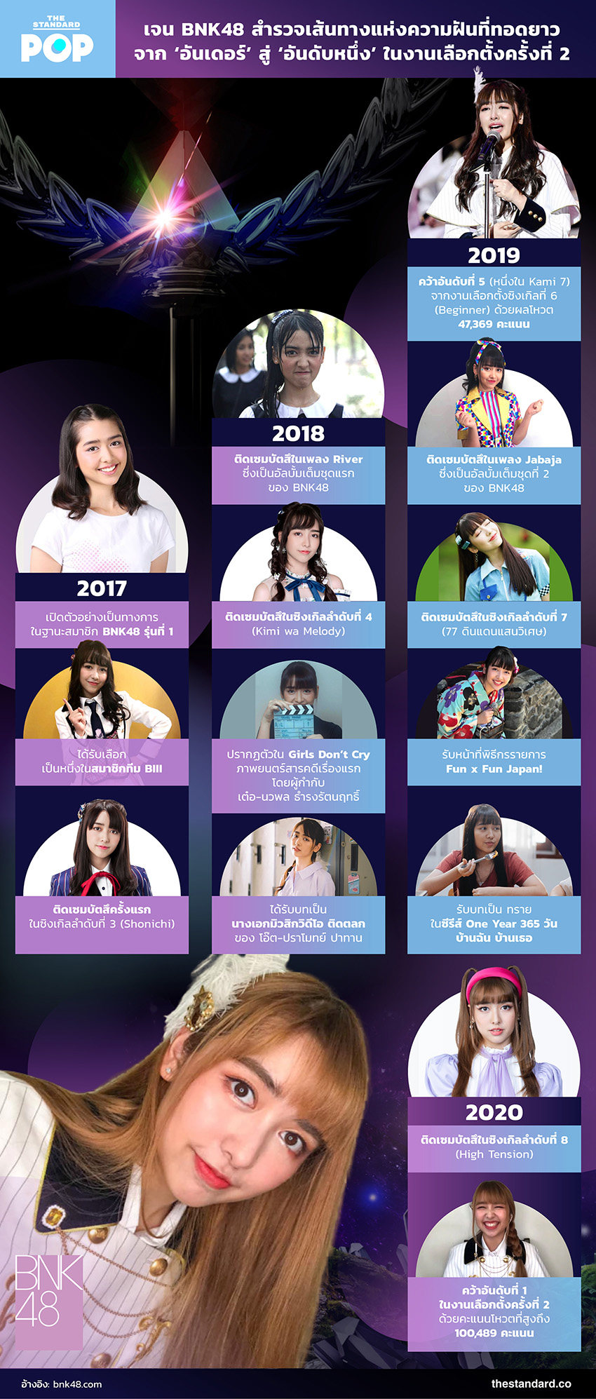 THE STANDARD POP ขอร่วมแสดงความยินดีให้กับเซ็นเตอร์คนใหม่ของ BNK48 ด้วยการพาทุกคนไปสำรวจเส้นทางแห่งความฝันและผลงานตลอดระยะเวลา 4 ปีของ เจน-กุลจิราณัฐ อินทรศิลป์ ‘สลอตผู้น่ารัก’ ที่เริ่มต้นจากตำแหน่งอันเดอร์เกิร์ลผู้ค่อยๆ สั่งสมประสบการณ์อย่างไม่เคยย่อท้อ