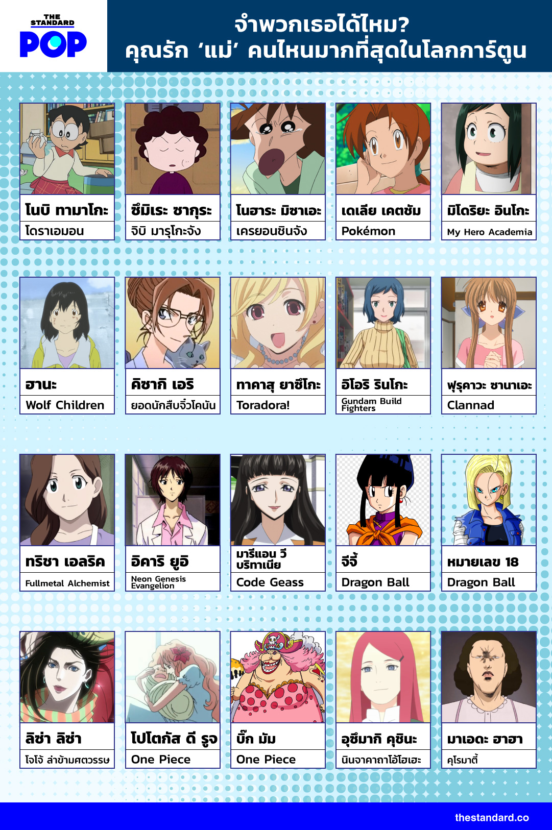THE STANDARD POP ได้รวบรวม 20 ตัวละครแม่ในโลกการ์ตูนญี่ปุ่นที่มีความสำคัญ เอกลักษณ์โดดเด่น เป็นที่รัก (หรืออาจจะไม่ก็ได้) ที่จดจำของลูกๆ และผู้ชม