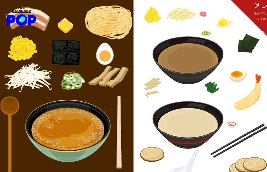 น้ำซุปของราเมนมักจะได้รับการปรุงรสด้วยส่วนผสมอย่างโชยุ หรือมิโซะ เช่นเดียวกับสาหร่ายทะเลที่เรียกว่าคอมบุ หรือสาหร่ายตากแห้งโนริ รวมถึงส่วนผสมอย่างเนื้อปลาคัตสึโอะหรือเกล็ดปลาโบนิโตะที่ช่วยเพิ่มกลิ่นอายของท้องทะเล ในขณะที่วัตถุดิบอย่างเห็ดชิตาเกะนั้นช่วยเพิ่มกลิ่นอายของภูเขา และรสกลมกล่อมอูมามิ แล้วจึงใส่ท็อปปิ้งอื่นๆ ได้แก่ ต้นหอม นารูโตมากิ (ลูกชิ้นปลาสีขาว ขอบหยัก มีลายเส้นสีชมพูม้วนเป็นวง) มีการใส่เนื้อสัตว์หั่นบางและไข่ต้มสุก เป็นอาทิ