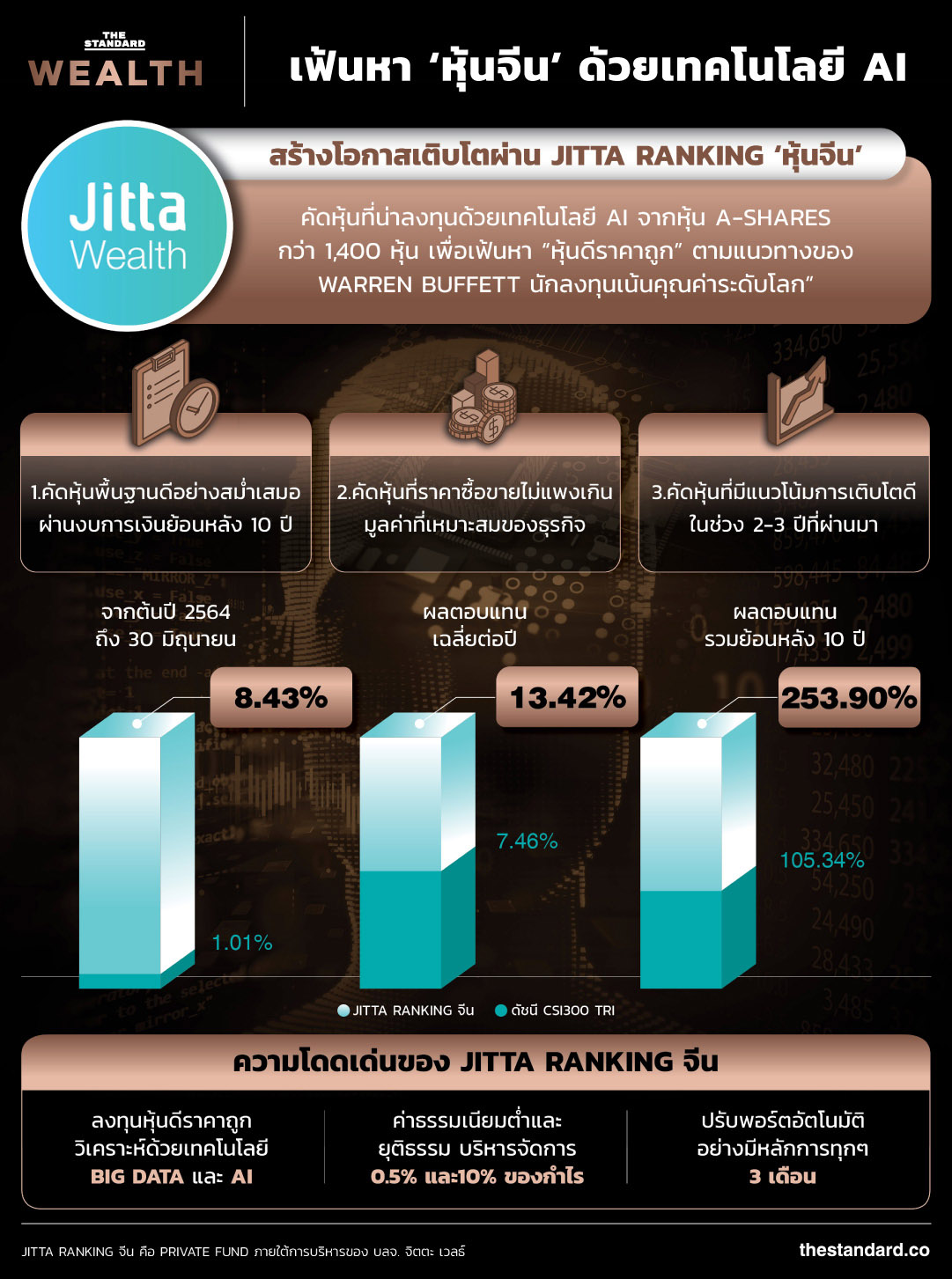 ‘Jitta Ranking จีน’ กองทุน private fund ที่คัดหุ้นน่าลงทุนด้วยเทคโนโลยี AI จากหุ้น A-shares กว่า 1,400 หุ้น เพื่อเฟ้นหา “หุ้นดีราคาถูก” ตามหลักการของ Warren Buffett นักลงทุนเน้นคุณค่าระดับโลก