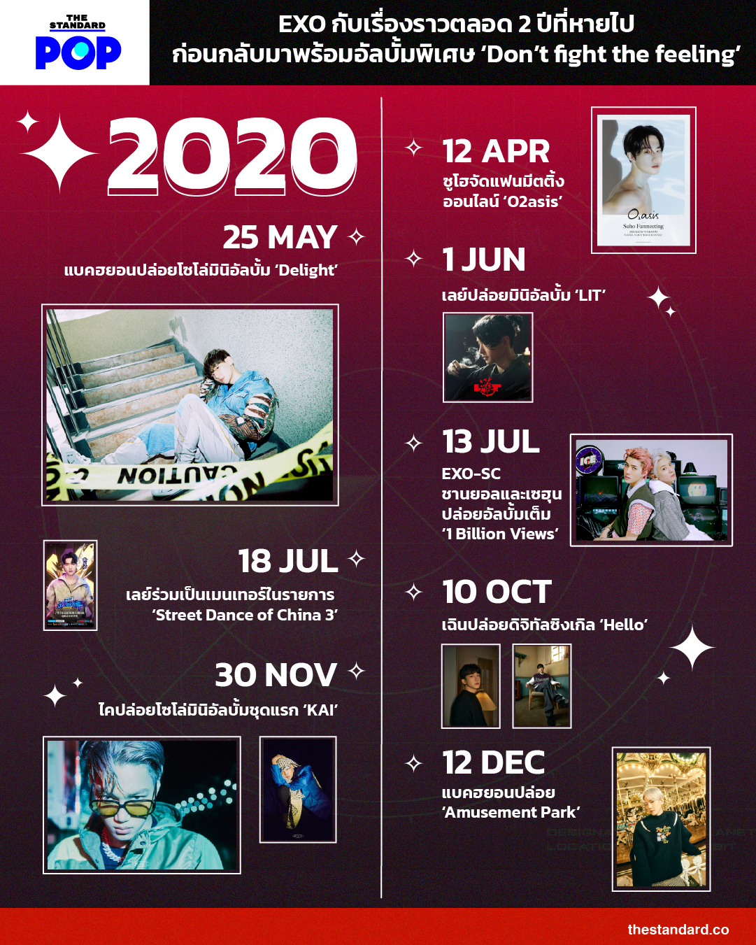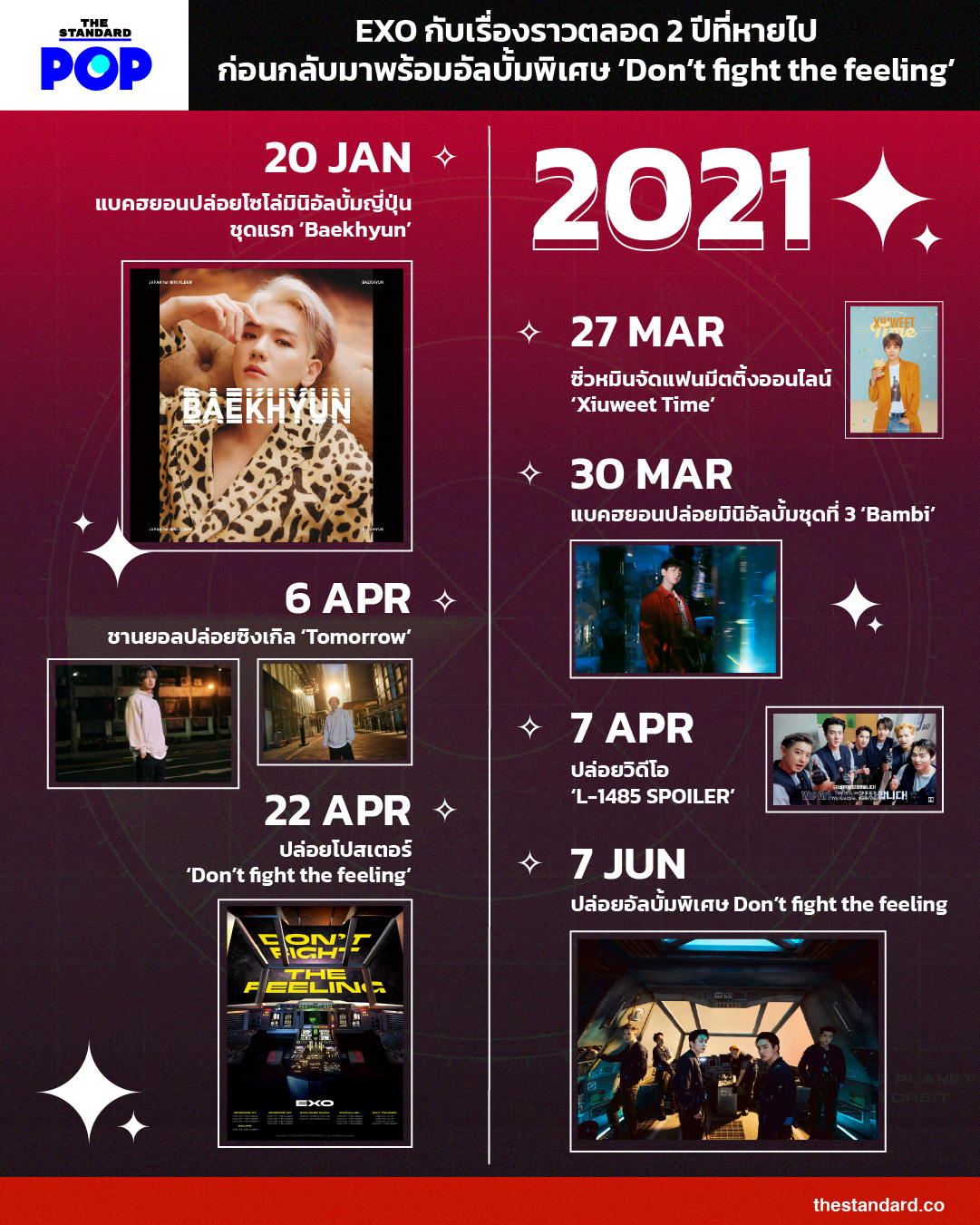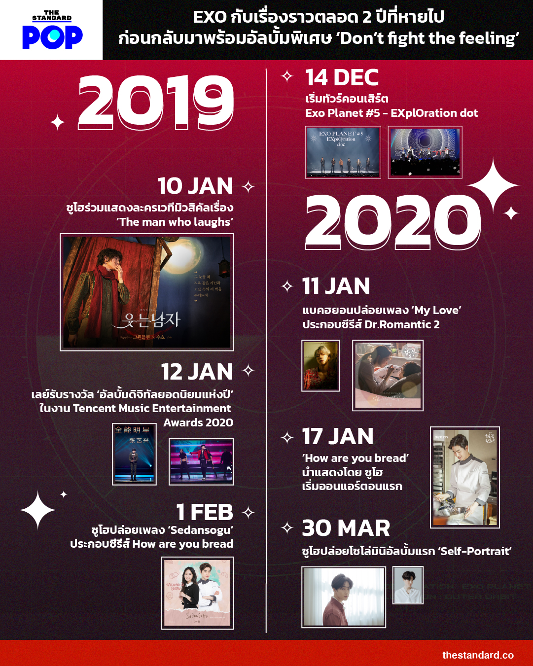 THE STANDARD POP ขออุ่นเครื่อง ชวนเหล่า EXO-L ย้อนชมเรื่องราวตลอด 2 ปีที่ผ่านมาของ EXO ว่าพวกเขาสร้างสรรค์ผลงานอะไรกันไว้บ้าง ก่อนที่จะได้รับชมมิวสิกวิดีโอและฟังอัลบั้ม Don’t fight the feeling พร้อมกันในวันที่ 7 มิถุนายนนี้