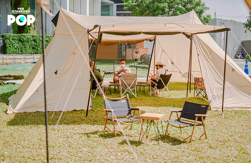 เมื่อเข้ามาบริเวณ Riverfront Marina Rama 3 จะพบกับสนามหญ้าริมแม่น้ำที่มีเต็นท์หลากหลายชนิดกางอยู่ และเบื้องหน้าเป็นวิวแม่น้ำเจ้าพระยากับเรือขนสินค้าลำใหญ่ นับว่าเป็นวิวที่แปลกตาและหาชมไม่ได้ที่บริเวณใจกลางเมือง ในเต็นท์หลังใหญ่ที่สุดเป็นที่ตั้งของโต๊ะบาริสต้าที่มีอุปกรณ์ชงกาแฟและแก้วน้ำสำหรับแคมป์ปิ้งวางไว้อยู่มากมาย เต็นท์รูปทรงแปลกๆ หลังนี้มีชื่อว่า ‘DoD Kamaboko Tent 2’ แบรนด์เต็นท์ที่มีเอกลักษณ์เป็นดีไซน์ที่เรียบง่าย น่ารัก และโลโก้รูปกระต่าย ชื่อรุ่นของเต็นท์ ‘Kamaboko’ นั้นแปลว่าลูกชิ้นปลาในภาษาญี่ปุ่น หลายคนน่าจะเคยเห็นลูกชิ้นปลาสีชมพูที่มีรูปทรงครึ่งวงกลมคล้ายเต็นท์หลังนี้ ทางร้านจึงจับชื่อนี้มาตั้งเป็นชื่อคาเฟ่ไปด้วยเลย เต็นท์หลังนี้มีขนาดใหญ่มาก ถ้านำไปแคมป์ปิ้งจริงๆ ก็สามารถจุคนได้กว่า 10 คนเลยทีเดียว ทางร้านจึงตัดสินใจนำมาทำเป็นเต็นท์หลังหลักสำหรับชงกาแฟและทำขนม และยังมีที่ว่างให้ชุดโต๊ะเก้าอี้สำหรับลูกค้าภายในเต็นท์หลังนี้อีกด้วย