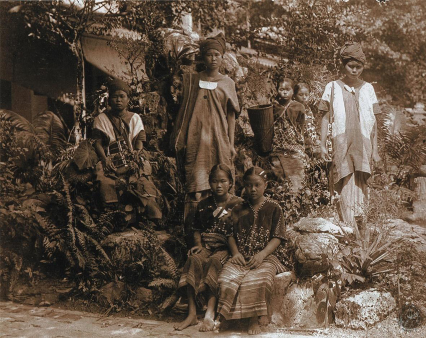 ชาวกะเหรี่ยงยืนถ่ายภาพบนเขามอที่วัดแห่งหนึ่งในกรุงเทพฯ ในพระราชพิธีรัชมังคลาภิเษก สมัยรัชกาลที่ 5 (ที่มาของภาพ: หอจดหมายเหตุแห่งชาติ)