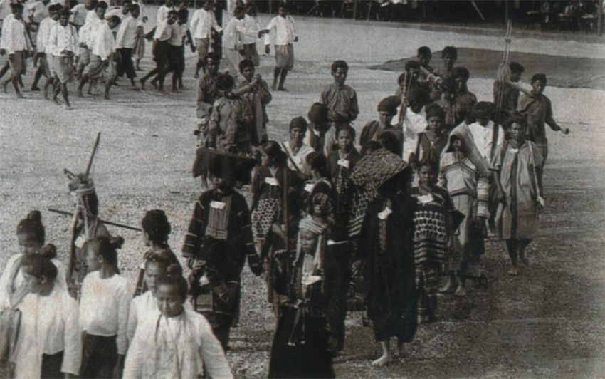 กระบวนแห่ของกลุ่มชาวเขาในพระราชพิธีรัชมังคลาภิเษก รัชกาลที่ 5 หนึ่งในนี้มีชาวกะเหรี่ยงด้วย (ที่มาของภาพ: หอจดหมายเหตุแห่งชาติ)