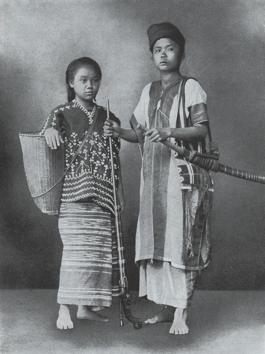 ผู้หญิงและผู้ชายขาวกะเหรี่ยง จากการแต่งกายน่าจะเป็นปกาเกอะญอ หรือ กะเหรี่ยงสะกอ ในพระราชพิธีรัชมังคลาภิเษก รัชกาลที่ 5 (ที่มาของภาพ: Döhring 1999:114, Pl.52)