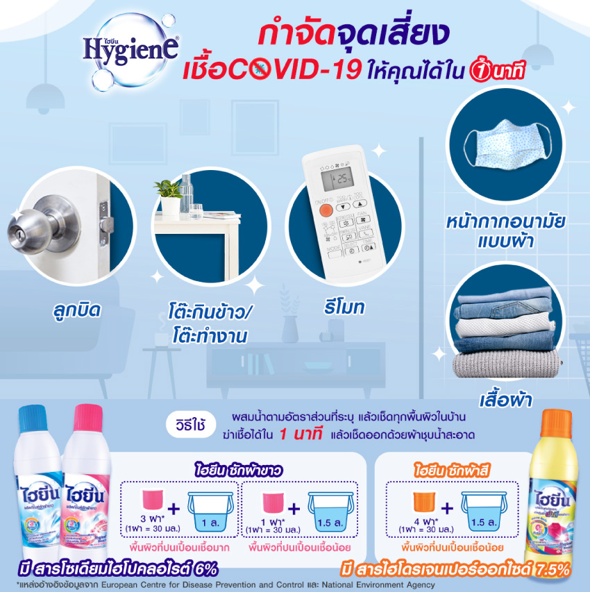 บ้านไหนที่ทำความสะอาดห้องน้ำและถูบ้านด้วยน้ำยาทำความสะอาดเหล่านี้เป็นประจำอยู่แล้ว ก็แค่เพิ่มขั้นตอนการใช้เข้าไปอีกหน่อย โดยเฉพาะ Work Station ควรเช็ดทำความสะอาดด้วย สูตร 1 ไฮยีนซักผ้าขาว เป็นประจำ ทั้งก่อนเริ่มทำงาน หลังจากพักเบรก และหลังจากทำงานเสร็จ เน้นย้ำจุดที่ต้องสัมผัสเป็นประจำ และอย่าลืมล้างมือให้สะอาดทุกครั้งด้วยสบู่หลังจากถอดถุงมือ และระวังอย่าให้มือสัมผัสดวงตา จมูก และปาก เพราะระหว่างการทำความสะอาดคุณอาจจะเคลื่อนไวรัสจากจุดหนึ่งไปสู่อีกจุดหนึ่งได้