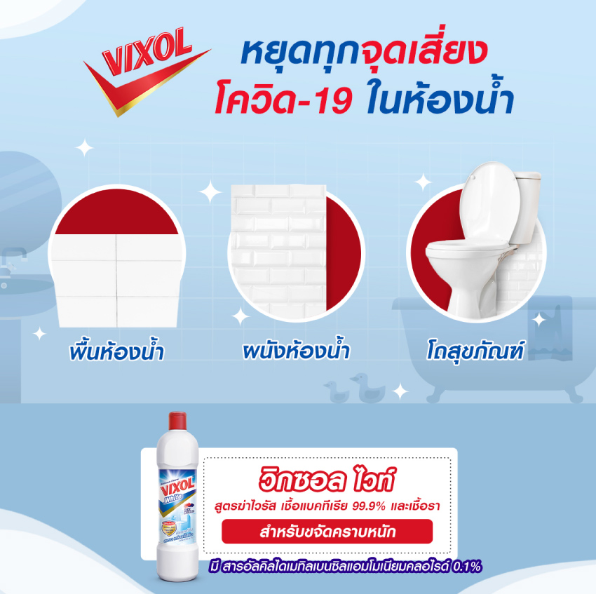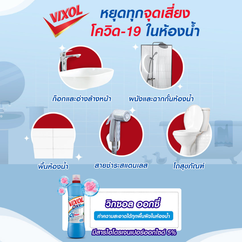 - วิกซอลออกซี่ไม่ต้องผสมน้ำ ทำความสะอาดห้องน้ำตามปกติ แต่ล้างให้บ่อยขึ้น