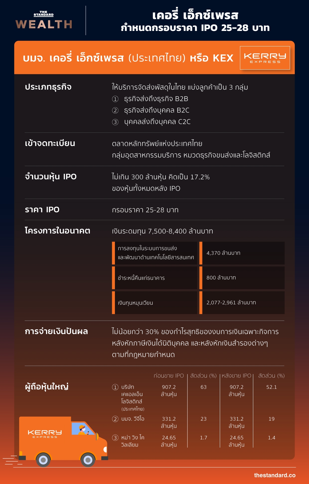 บมจ. เคอรี่ เอ็กซ์เพรส (ประเทศไทย) หรือ KEX กำหนดช่วงราคาขายเบื้องต้นที่ 25-28 บาทต่อหุ้น จากนั้นสำรวจความต้องการจองซื้อหุ้น IPO ของนักลงทุนสถาบัน (Bookbuilding) เพื่อกำหนดราคาเสนอขายสุดท้าย ซึ่งจะประกาศในวันที่ 15 ธันวาคม 2563 โดยจะเปิดให้นักลงทุนรายย่อยจองซื้อวันที่ 8, 9 และ 14 ธันวาคมนี้ ที่ราคา 28.00 บาทต่อหุ้น ซึ่งเป็นราคาสูงสุดของช่วงราคาเสนอขายเบื้องต้น ส่วนนักลงทุนสถาบันจองซื้อในวันที่ 16-18 ธันวาคมนี้ ที่ราคาเสนอขายสุดท้าย ทั้งนี้ KEX คาดว่าจะเข้าซื้อขายในตลาดหลักทรัพย์วันแรกปลายเดือนธันวาคมนี้