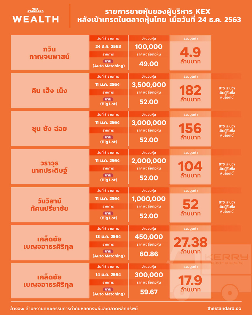 ทั้งนี้หากย้อนดูวันแรกที่ KEX เข้าซื้อขายในตลาดหุ้นไทยวันแรกคือวันที่ 24 ธันวาคม 2563 พบว่า กวิน กาญจนพาสน์ กรรมการ KEX ได้ขายหุ้น KEX ออกมา 100,000 หุ้น ราคาเฉลี่ยหุ้นละ 49 บาท คิดเป็นมูลค่ารวม 4.9 ล้านบาท