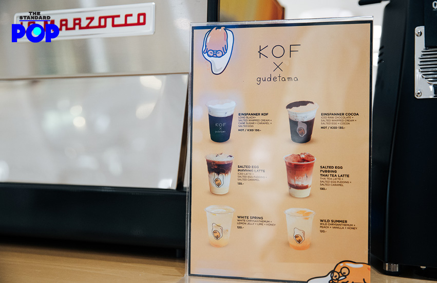 เริ่มที่เมนูกาแฟทั้งสองเมนูอย่าง Einspanner KOF (130 บาท) กาแฟ Long Black เพิ่มความหวานด้วยคาราเมลและน้ำตาลอ้อย ด้านบนทำลวดลายไข่สุดน่ารักด้วยวิปครีมและผงไข่เค็ม ส่วนกาแฟนมก็มี Salted Egg Pudding Latte (135 บาท) ลาเต้เย็นที่เพิ่มความสนุกด้วยพุดดิ้งไข่เค็มก้นแก้ว โรยหน้าด้วยซอล์ตคาราเมล ต่อด้วยเมนูเติมความหวาน Einspanner Cocoa (130 บาท) ช็อกโกแลตเย็นแบบเข้มข้นที่ทำลวดลายไข่ด้วยวิปครีมและผงไข่เค็ม Salted Egg Pudding Thai Tea Latte (130 บาท) ชาไทยสีส้มสดใสบวกกับพุดดิ้งไข่เค็มเนื้อนุ่มละมุน โรยหน้าด้วยไข่เค็ม ปิดท้ายด้วยเมนูชาใส White Spring (120 บาท) ที่จะพาคุณท่องไปในฤดูใบไม้ผลิด้วยน้ำเก๊กฮวยขาวที่มาพร้อมดอกเก๊กฮวยแสนสวย เพิ่มความสดชื่นด้วยเยลลีมะนาวและน้ำผึ้งหอมๆ ส่วนใครที่ชอบความหวานละมุนก็ต้องลอง Wild Summer (120 บาท) น้ำเก๊กฮวยป่า ลูกพีช วานิลลา และน้ำผึ้ง เป็นส่วนผสมของความนุ่มละมุนที่เข้ากันได้เป็นอย่างดี
