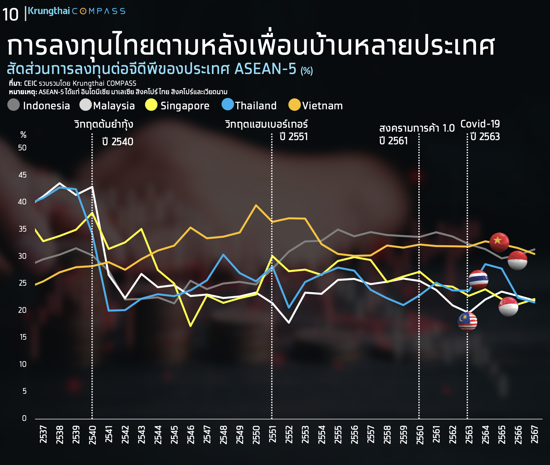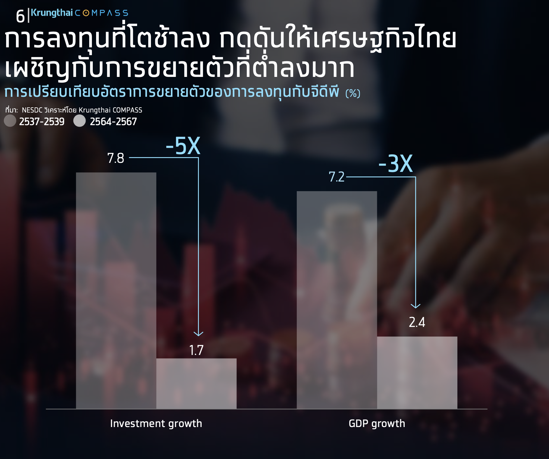 Krungthai COMPASS ประเมิน การยกเครื่องการลงทุนใน 6 อุตสาหกรรมเป้าหมาย ตามแนวทาง Reinvent Thailand จะช่วยเพิ่มอัตราเติบโต GDP ไทยระยะข้างหน้าได้อีกประมาณ 0.2-0.4% ต่อปี หลังพบในช่วง 20 ปีที่ผ่านมา การลงทุนในไทยแผ่วลง 5 เท่า ฉุด GDP ช้าลง 3 เท่า