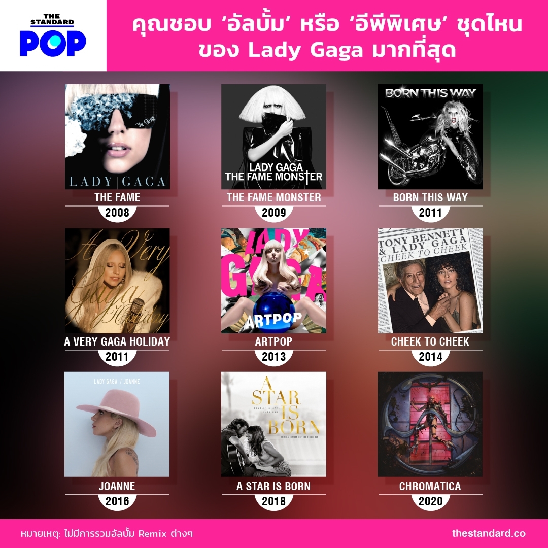 ในวาระที่อัลบั้มใหม่ของเธอ Chromatica เพิ่งปล่อยออกมาเมื่อวันที่ 29 พฤษภาคมที่ผ่านมา THE STANDARD POP เลยอยากรู้ว่าแฟนเพลงและ Little Monster ชอบอัลบั้มหรืออีพีไหนของ เลดี้ กาก้า มากที่สุด เพื่อใครที่ไม่เคยฟังมาก่อนจะหาโอกาสไปฟัง