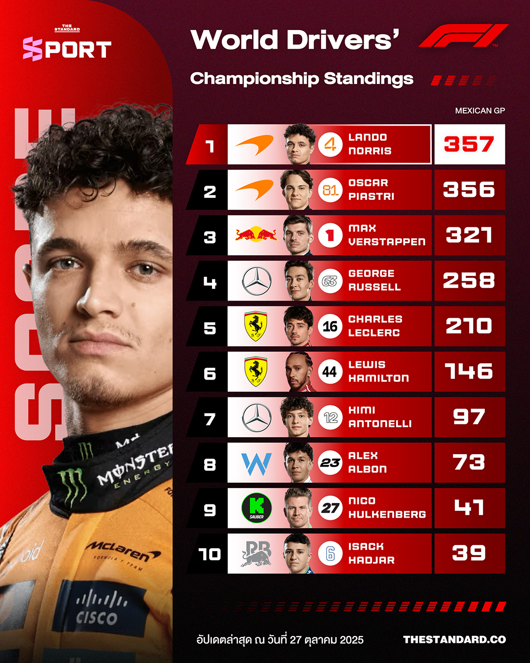 สถานการณ์การลุ้นแชมป์โลกประเภทนักขับ มีการเปลี่ยนแปลงครั้งใหญ่ในรอบหลายเรซ หลังการคว้าชัยของ แลนโด นอร์ริส ในเม็กซิกันกรังด์ปรีซ์ ทำให้เขาแซงมารั้งอันดับ 1 ในตารางคะแนนรวมแล้ว