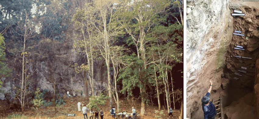 ภาพซ้าย เพิงผาถ้ำลอดเมื่อเดือนเมษายน ปี 2544 ในช่วงเริ่มต้นการขุดค้น (อ้างอิง: โครงการโบราณคดีบนพื้นที่สูงในอำเภอปางมะผ้า จังหวัดแม่ฮ่องสอน) และภาพขวา หลุมขุดค้นที่ 1 ภายหลังการขุดค้นเสร็จสิ้นแล้ว มีความลึกประมาณ 4 เมตร