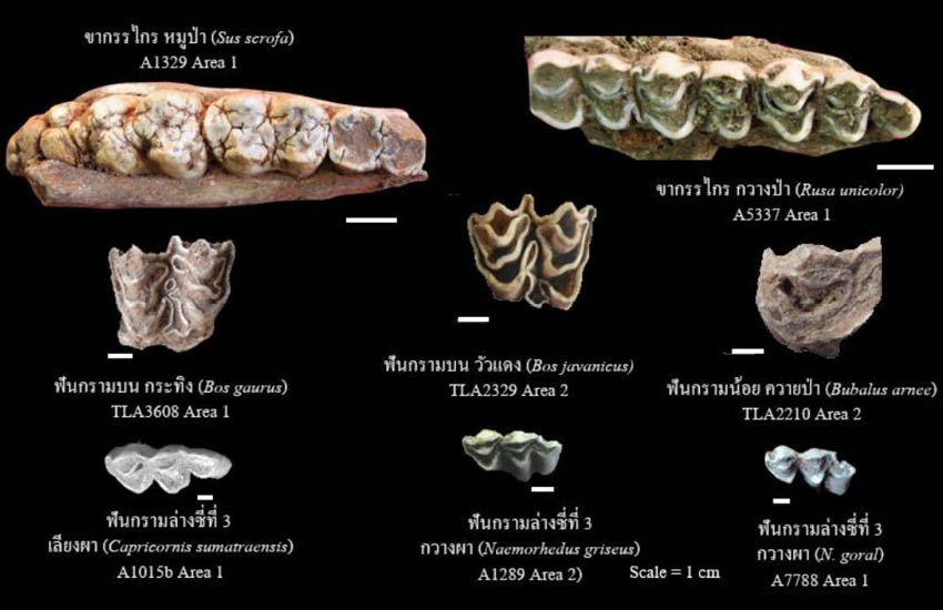 ฟันของสัตว์ชนิดต่างๆ ที่พบจากการขุดค้นที่เพิงผาถ้ำลอด (อ้างอิง: อธิวัตน์ วัฒนะพิทักษ์สกุล 2563)
