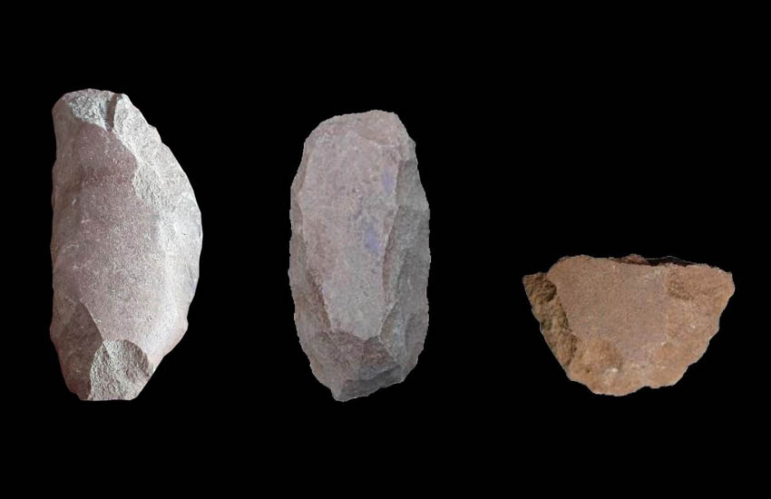 เครื่องมือหินกะเทาะแบบโหบินเนียน ด้านซ้ายสุดเป็นเครื่องมือสำหรับแล่เนื้อ ตรงกลางเป็นขวานหิน นักโบราณคดีเรียกว่า ‘สุมาตราลิธ’ ภาพขวาสุดเป็นชิ้นส่วนของเครื่องหินแบบสุมาตราลิธที่ชำรุดเหลือแต่ส่วนปลาย ที่พบที่เพิงผาถ้ำลอด