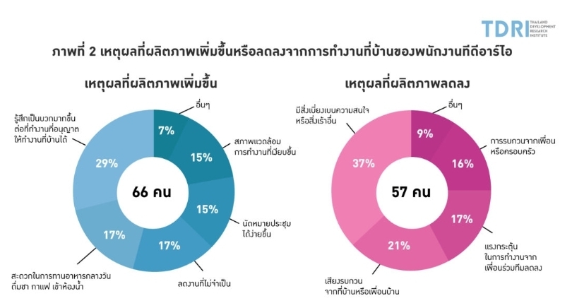 ในขณะเดียวกัน เหตุผลสำคัญที่พนักงานส่วนหนึ่งประเมินว่า การทำงานที่บ้านทำให้ตนมีประสิทธิภาพลดลงคือ มีสิ่งเบี่ยงเบนความสนใจหรือสิ่งเร้าอื่น (เช่น การดูหนัง เล่มเกม เล่นอินเทอร์เน็ต) (ร้อยละ 37) รองลงมาคือ มีเสียงรบกวนที่บ้านหรือเพื่อนบ้าน มีแรงกระตุ้นในการทำงานจากเพื่อนร่วมทีมลดลง และถูกรบกวนจากเพื่อนหรือครอบครัว เช่น ครอบครัวที่มีเด็กเล็ก หรือไม่มีห้องส่วนตัว (ภาพที่ 2)