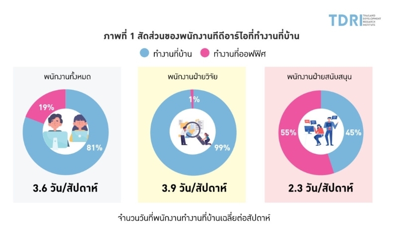 บทความนี้จะนำเสนอผลการศึกษาผลกระทบของการทำงานที่บ้านในช่วงโควิด-19 โดยใช้กรณีศึกษาของสถาบันวิจัยเพื่อการพัฒานาประเทศไทย (ทีดีอาร์ไอ) ซึ่งเป็นต้นสังกัดของผู้เขียน โดยศึกษาในระหว่างวันที่ 24 เมษายน – 1 พฤษภาคม 2563 เป็นช่วงเวลาประมาณ 1 เดือน นับตั้งแต่ทีดีอาร์ไอเริ่มมีนโยบายให้พนักงานทำงานที่บ้านได้ตั้งแต่กลางเดือนมีนาคม 2563 โดยมีจำนวนผู้ตอบแบบสอบถามทั้งสิ้น 97 คน คิดเป็นร้อยละ 71 ของจำนวนพนักงานทั้งหมด ทั้งนี้ แม้ทีดีอาร์ไอ ซึ่งเป็นสถาบันวิจัย ไม่สามารถเป็นตัวแทนขององค์กรอื่นๆ ในประเทศไทยได้ ผู้เขียนก็เชื่อว่า ผลการศึกษานี้น่าจะให้มุมมองบางอย่างที่เป็นประโยชน์ต่อองค์กรอื่นๆ ได้บ้าง