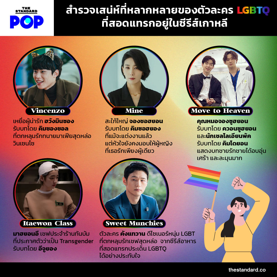 เรายังอยู่ในช่วง Pride Month ตลอดทั้งเดือนมิถุนายน ดังนั้นเพื่อให้คงบรรยากาศความหลากหลายทางเพศ THE STANDARD POP จึงอยากพาทุกคนไปสำรวจเสน่ห์ที่หลากหลายของตัวละคร LGBTQ ที่สอดแทรกอยู่ในซีรีส์เกาหลี เพื่อสะท้อนให้เห็นว่าบทบาทสื่อ และอุตสาหกรรมบันเทิงในเกาหลีใต้ ก็ค่อยๆ นำเสนอและสอดแทรกเรื่องราวของกลุ่ม LGBTQ เข้าไปเป็นส่วนหนึ่งในซีรีส์มากขึ้น ไม่ว่าจะเป็นตัวละครหลักหรือไม่ แต่การมีอยู่ของความหลากหลายทางเพศที่เริ่มปรากฏให้เห็นเนื้อหาของซีรีส์ ถือเป็นสัญญาณที่ดีในการรณรงค์ให้ผู้ชมรับรู้ถึงการมีอยู่ของเหล่า LGBTQ อย่างแนบเนียน ต่อไปนี้เป็นตัวละคร LGBTQ ที่เต็มไปด้วยเสน่ห์จากซีรีส์เรื่องโปรดของใครหลายๆ คน เราไปสำรวจกันเลยว่ามีบทบาทไหนที่ประทับใจคนดูซีรีส์บ้าง