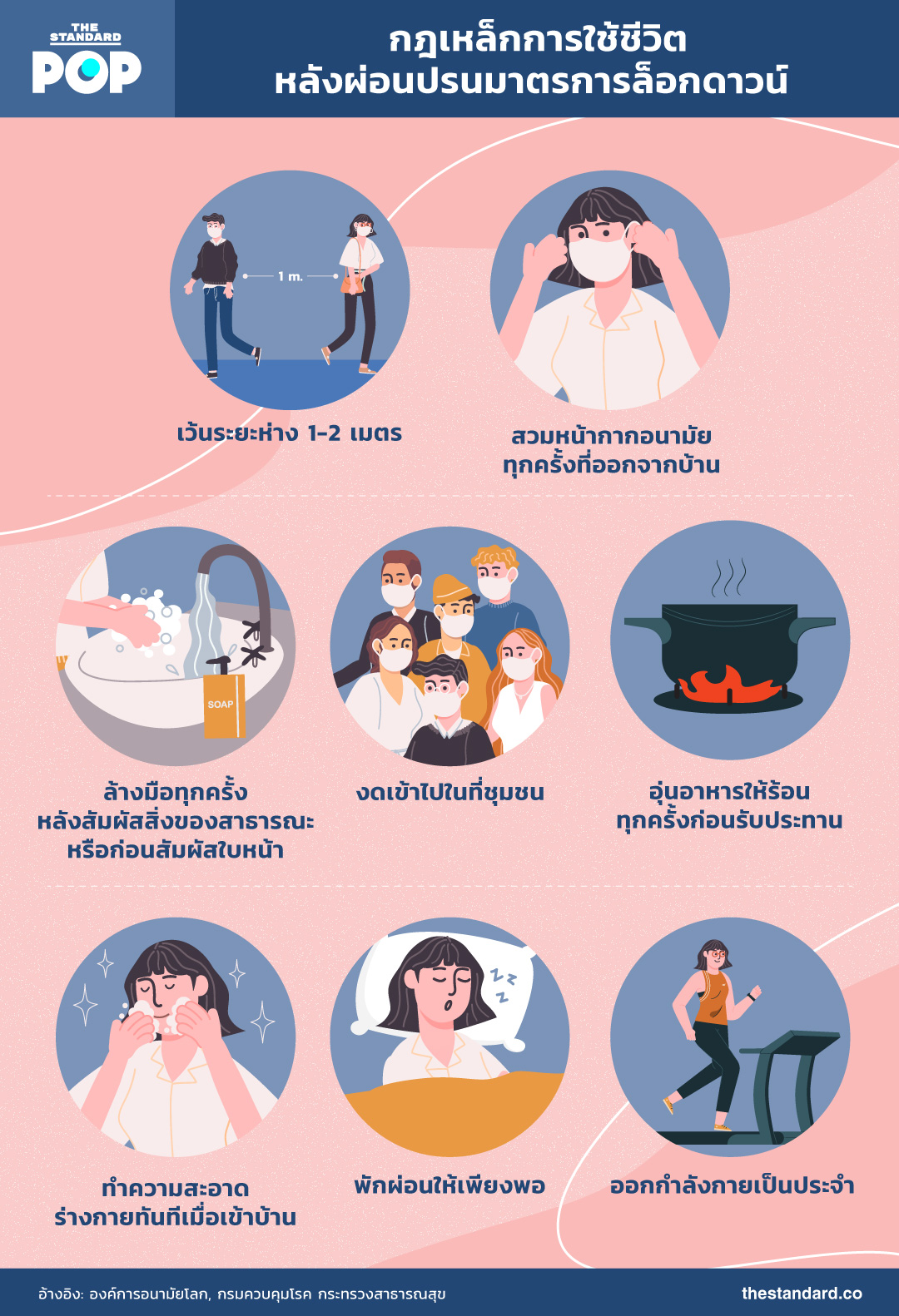 แม้ว่ารัฐบาลจะเริ่มผ่อนปรนมาตรการล็อกดาวน์เพื่อให้ประชาชนใช้ชีวิตและเศรษฐกิจได้เดินหน้าต่อ ทว่าโรคระบาดยังไม่จบสิ้น เพียงแค่ทุเลาให้อยู่ในระดับที่ควบคุมได้ ฉะนั้นเรายังคงต้องปฏิบัติตามกฎเหล็กเหล่านี้เสมอเพื่อไม่ให้จำนวนผู้ติดเชื้อกลับมาเพิ่มขึ้นอีกครั้ง