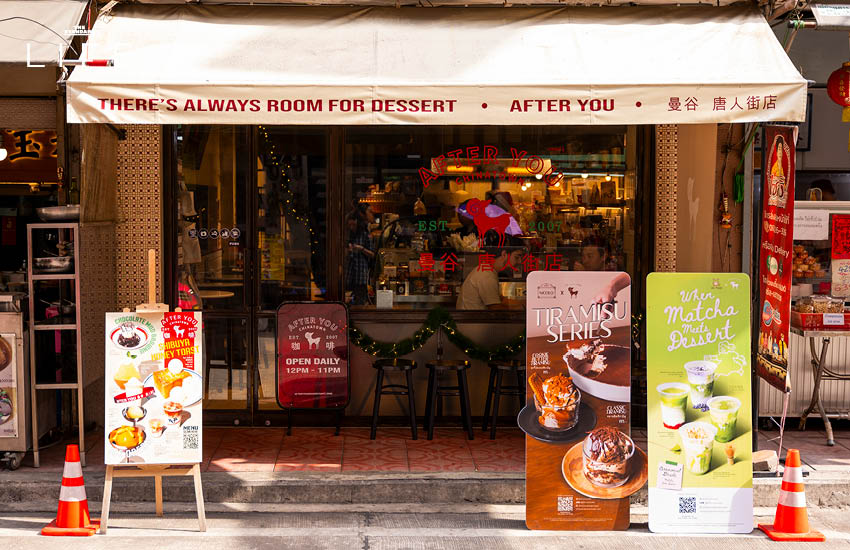 หลังจากเดินสำเพ็งจนเริ่มหิว จุดหมายถัดไปของเอมมี่ก็มักจะเป็นเยาวราช และ หนึ่งในร้านของหวานที่เธอชอบแวะก็คือ After You สาขาเยาวราช สาขานี้มีเสน่ห์ต่างจากที่อื่นตรงบรรยากาศที่ให้ฟีลร้านน้ำชาเก่าๆ สไตล์จีน มีความวินเทจ นั่งแล้วสบาย ไม่เร่งรีบ
