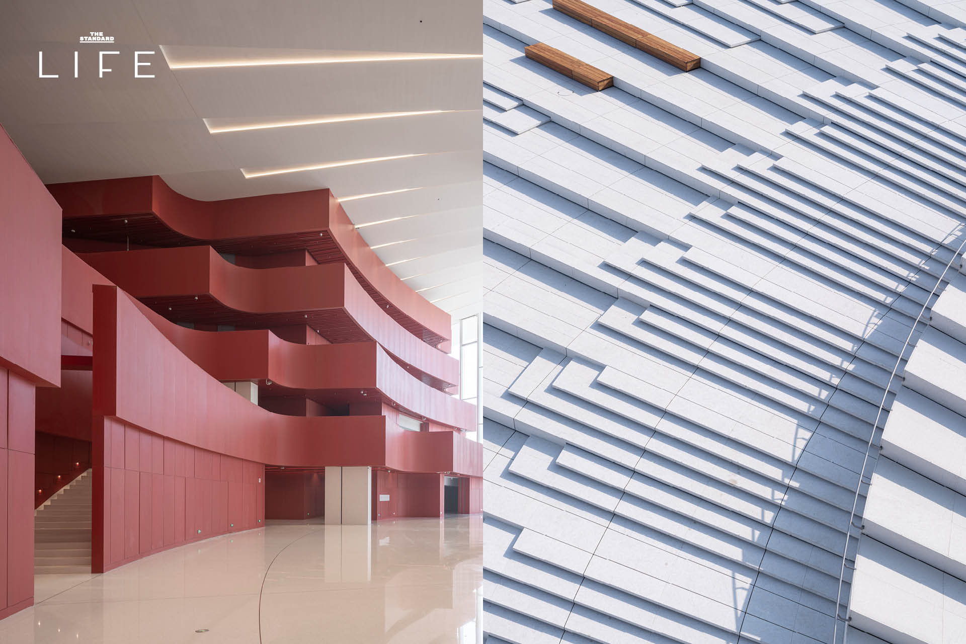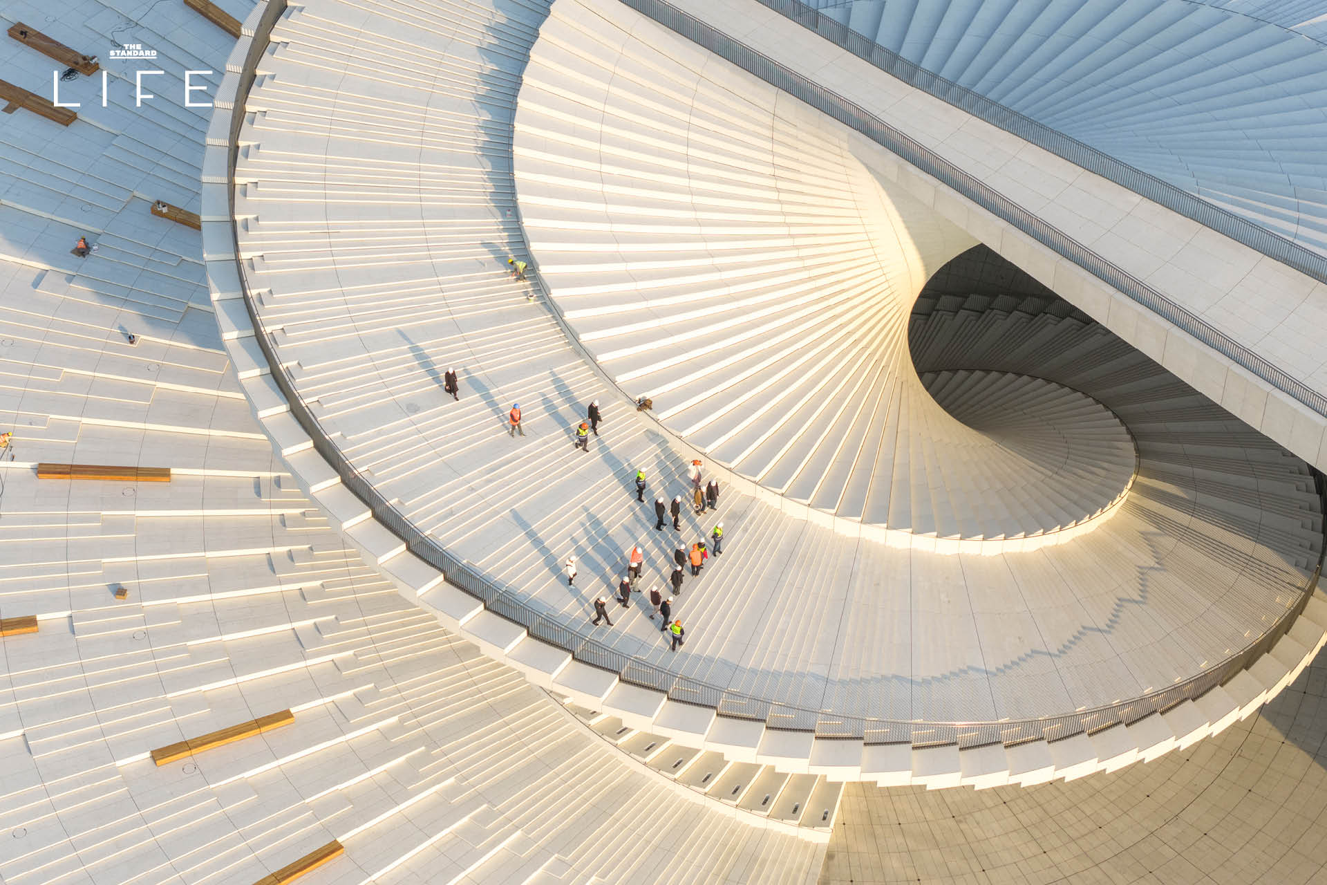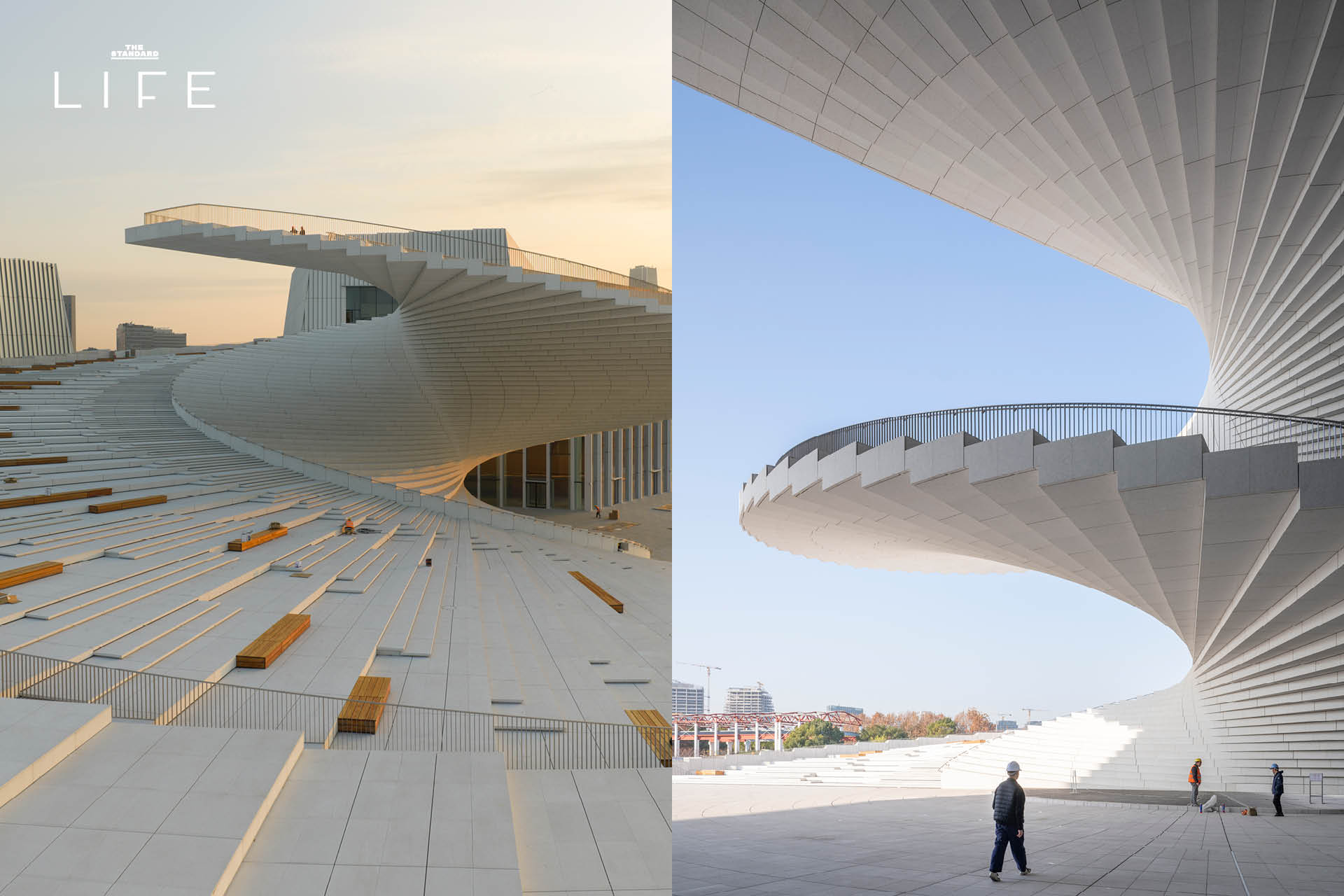 แน่นอนว่าจุดเด่นของโอเปราเฮาส์หลังนี้ก็คือโซน Rooftop ซึ่งมีลักษณะเป็น Helical Roof หลังคาเกลียววนที่ดีไซน์ให้เป็น Spiral Staircase Roof หลังคาแบบบันไดวนในตัว สถาปัตยกรรมนี้ออกแบบโดยได้แรงบันดาลใจมาจากจังหวะการเต้นและการเคลื่อนไหวร่างกายมนุษย์ที่ลื่นไหลโค้งงอได้อย่างอิสระซึ่งเป็นจิตวิญญาณสำคัญที่ทำให้การแสดง (Performing) ทรงพลังและมีความหมายยิ่งขึ้น ผสมผสานกับรูปทรงการคลี่พัดอันเป็นอัตลักษณ์หนึ่งของวัฒนธรรมจีนที่แสนมีเสน่ห์