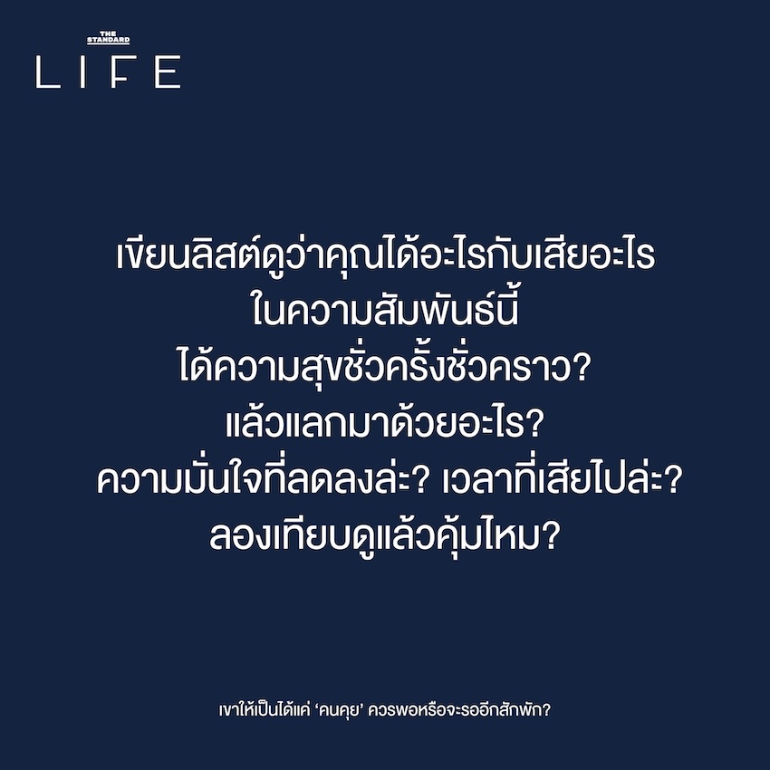 เขียนลิสต์ดูว่าคุณได้อะไรกับเสียอะไรในความสัมพันธ์นี้ ได้ความสุขชั่วครั้งชั่วคราว? แล้วแลกมาด้วยอะไร? ความมั่นใจที่ลดลงล่ะ? เวลาที่เสียไปล่ะ? ลองเทียบดูแล้วคุ้มไหม?