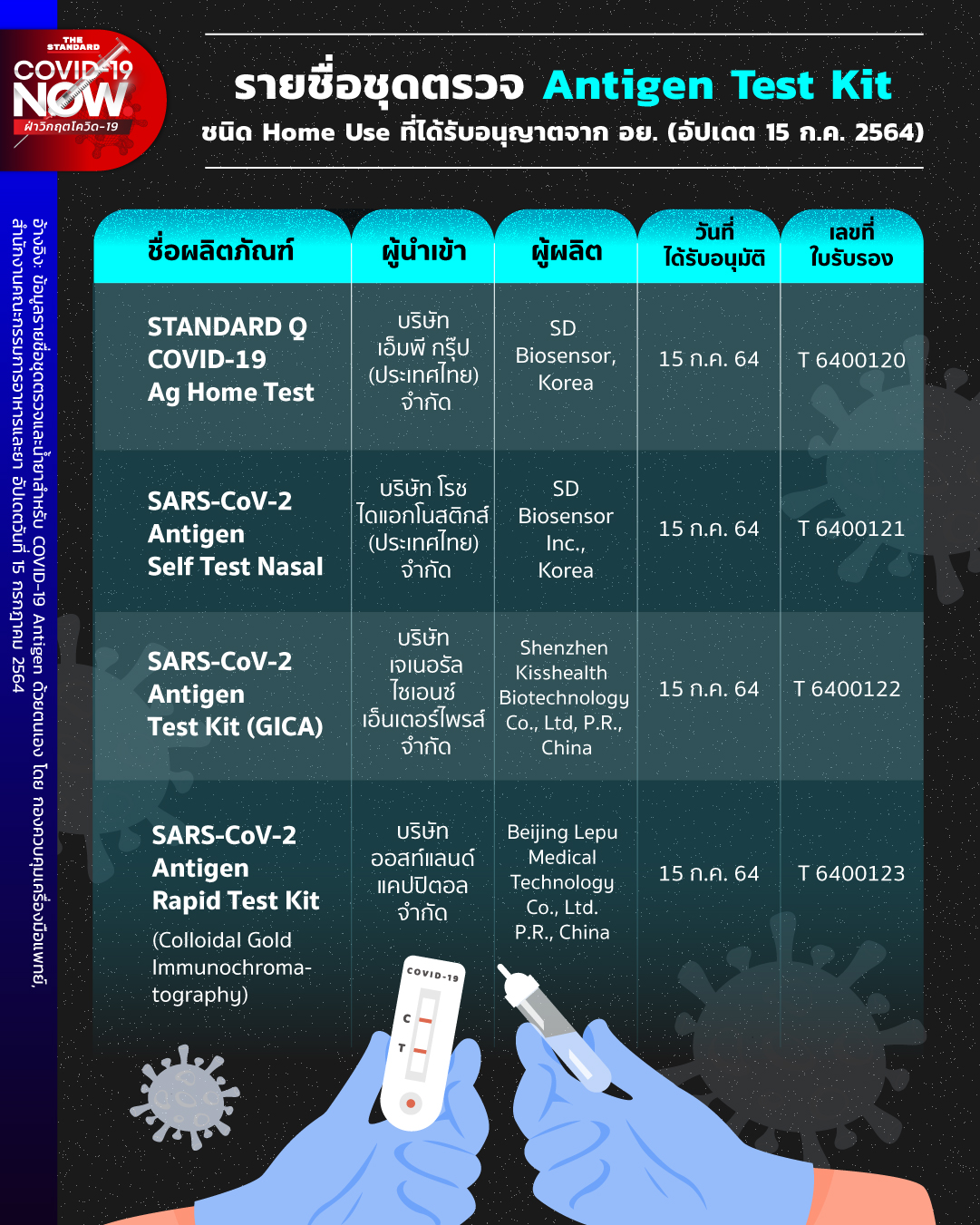 - ข้อมูลรายชื่อชุดตรวจและน้ำยาสำหรับ COVID-19 Antigen ด้วยตนเอง โดย กองควบคุมเครื่องมือแพทย์, สำนักงานคณะกรรมการอาหารและยา อัปเดตวันที่ 15 กรกฎาคม 2564
