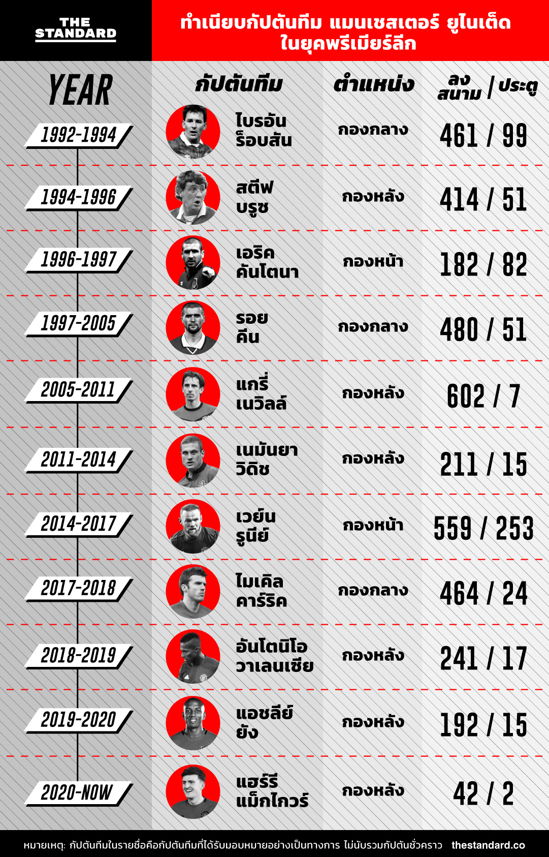 THE STANDARD จึงอยากพาย้อนดูทำเนียบกัปตันทีมของแมนเชสเตอร์ ยูไนเต็ด นับตั้งแต่การเริ่มต้นของพรีเมียร์ลีกในปี 1992