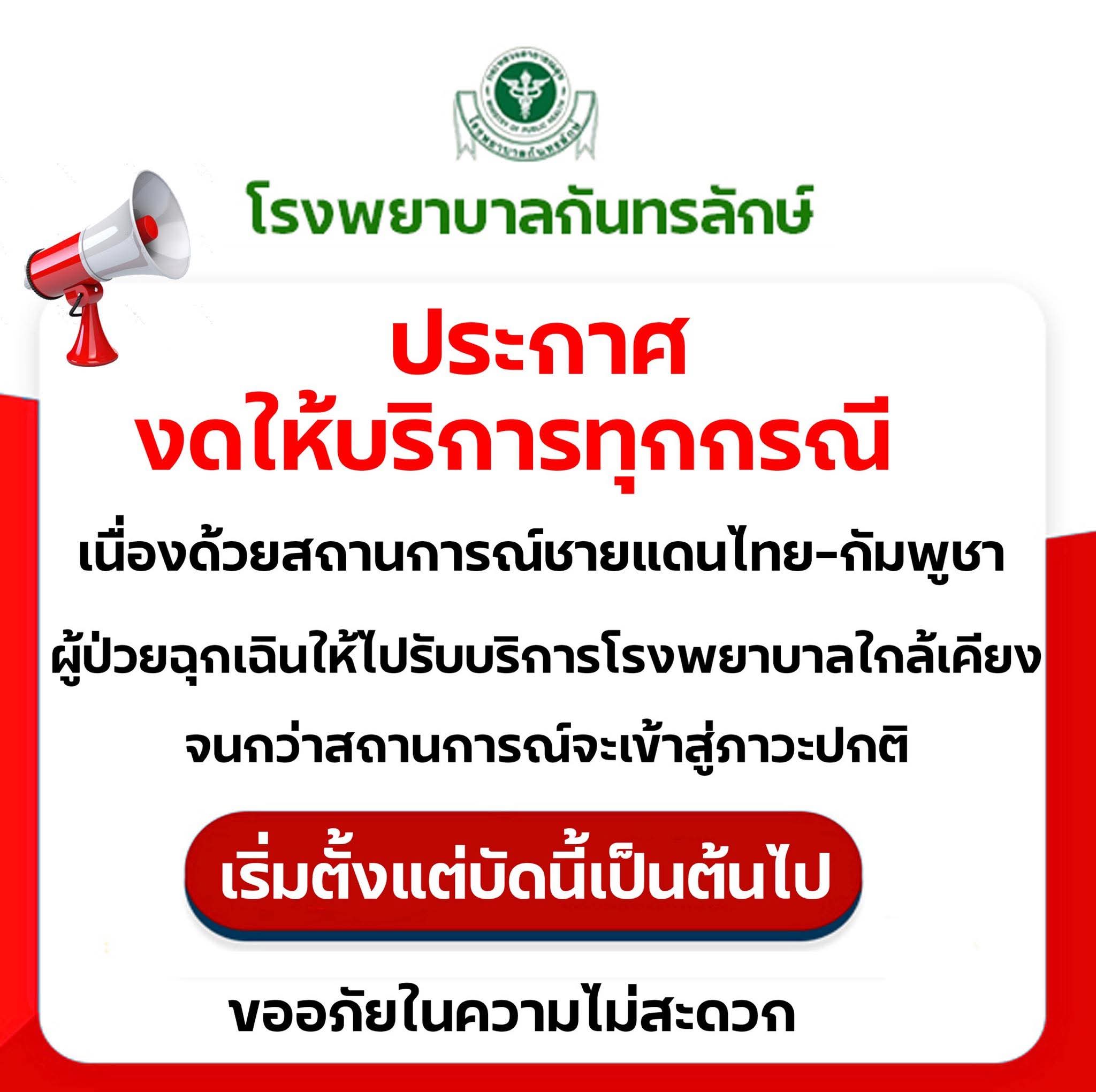 รพ.กันทรลักษ์ประกาศงดให้บริการทุกกรณี เนื่องด้วยสถานการณ์ชายแดนไทย-กัมพูชา ขอให้ผู้ป่วยฉุกเฉินไปรับบริการที่โรงพยาบาลใกล้เคียงจนกว่าสถานการณ์จะเข้าสู่ภาวะปกติ