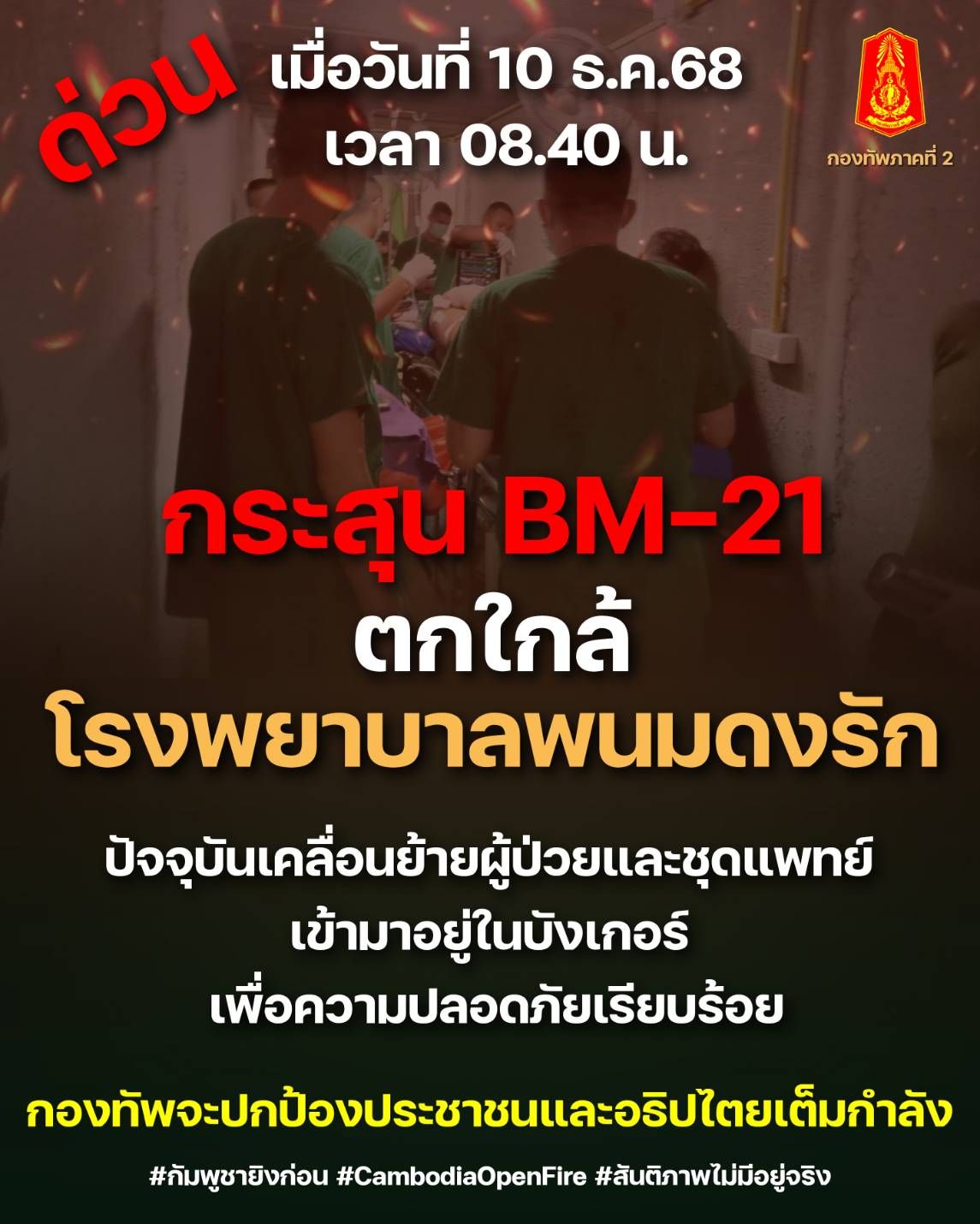 กองทัพภาคที่ 2 เปิดเผยว่า ได้รับแจ้งคืนนี้ กัมพูชาจะใช้จรวดหลายลำกล้อง (BM-21) ทำการยิงเข้ามายังดินแดนไทย ยืนยันกองทัพจะยับยั้ง ป้องกัน และตอบโต้ภัยคุกคามนี้อย่างหนักหน่วงและเต็มขีดความสามารถ