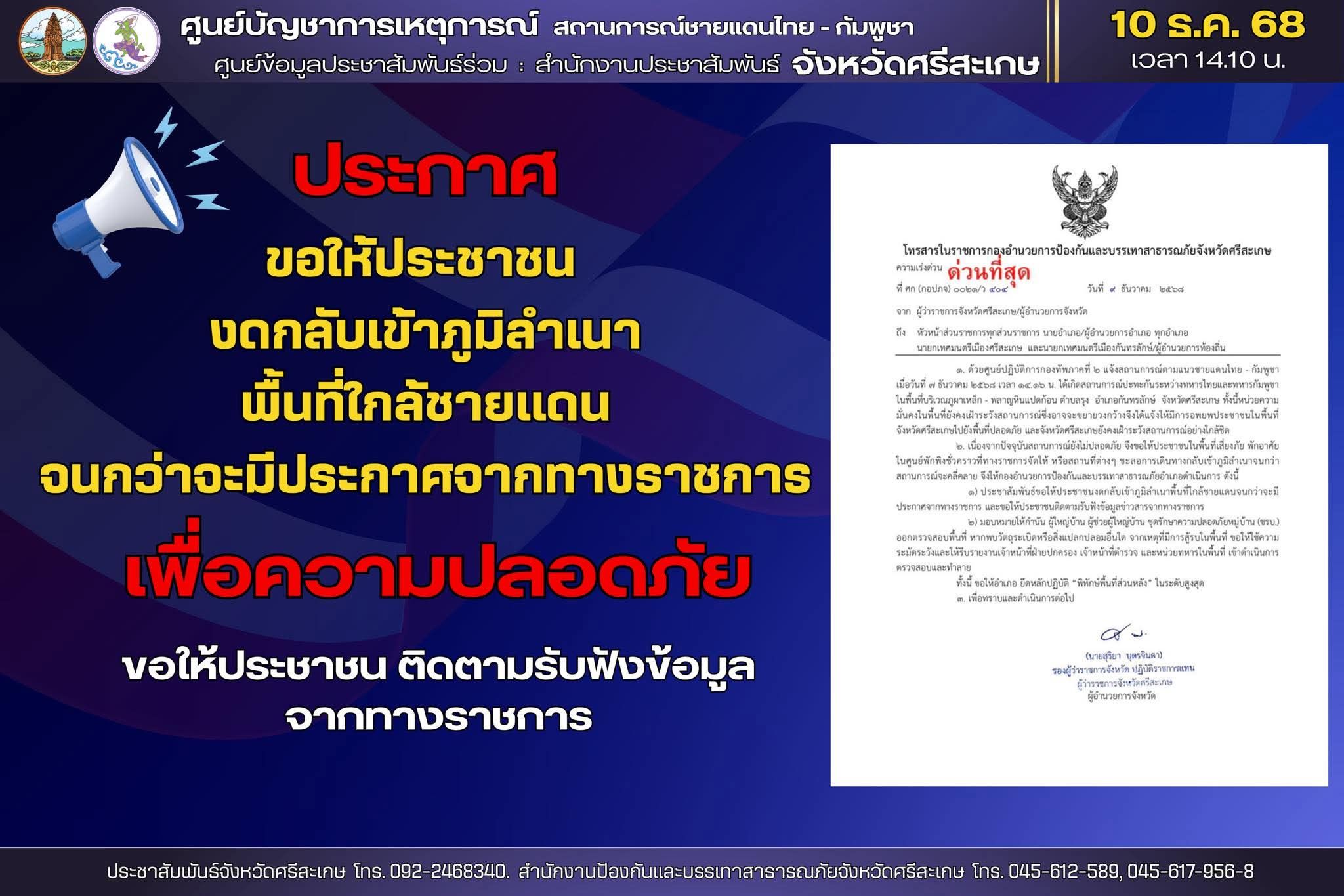 เหตุการณ์ล่าสุด (13 ธ.ค. 68) เกิดเหตุ ลูกระเบิดจรวด BM-21 ตกใส่พื้นที่ชุมชนใน จังหวัดศรีสะเกษ โดยไม่คาดคิด ส่งผลให้ประชาชนบาดเจ็บสาหัส 2 คน บ้านเรือนเสียหาย 2 หลัง ด้านอนุรัตน์ ธรรมประจำจิต ผู้ว่าราชการจังหวัดศรีสะเกษ จึงได้มีคำสั่งกำชับไปยังประชาชนอย่างเด็ดขาด