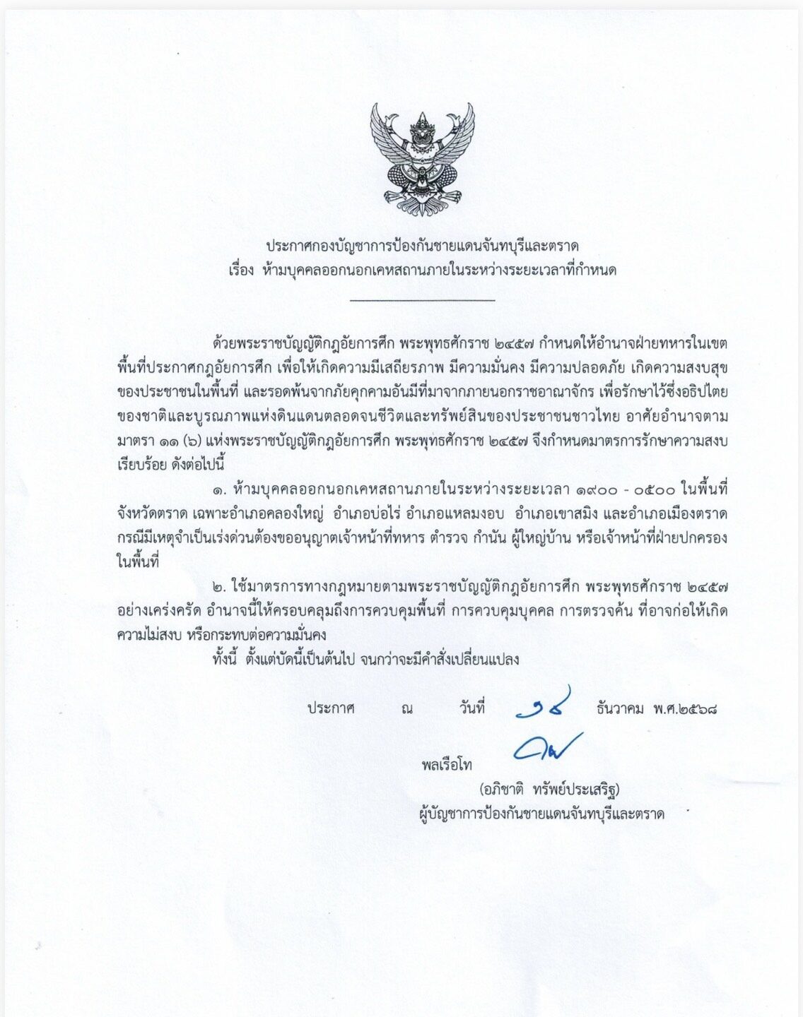 ประกาศดังกล่าวอาศัยอำนาจตามพระราชบัญญัติกฎอัยการศึก พ.ศ. 2457 กำหนดให้ห้ามประชาชนออกนอกเคหสถานในช่วงเวลา 19.00-05.00 น. ครอบคลุมพื้นที่อำเภอคลองใหญ่ บ่อไร่ แหลมงอบ เขาสมิง และอำเภอเมืองตราด เว้นแต่มีเหตุจำเป็นเร่งด่วนและได้รับอนุญาตจากเจ้าหน้าที่ในพื้นที่