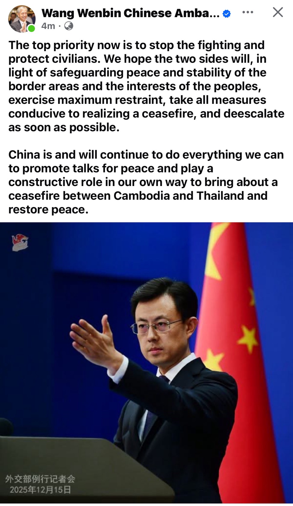 ทูตจีนประจำกัมพูชาชี้ การยุติสู้รบและปกป้องพลเรือนเป็นเรื่องสำคัญที่สุด จีนหวังไทย-กัมพูชาคำนึงถึงการปกป้องสันติภาพและเสถียรภาพในพื้นที่ชายแดน ให้สองฝ่ายอดกลั้น และดำเนินมาตรการทุกวิถีทางที่จะนำไปสู่การบรรลุข้อตกลงหยุดยิง