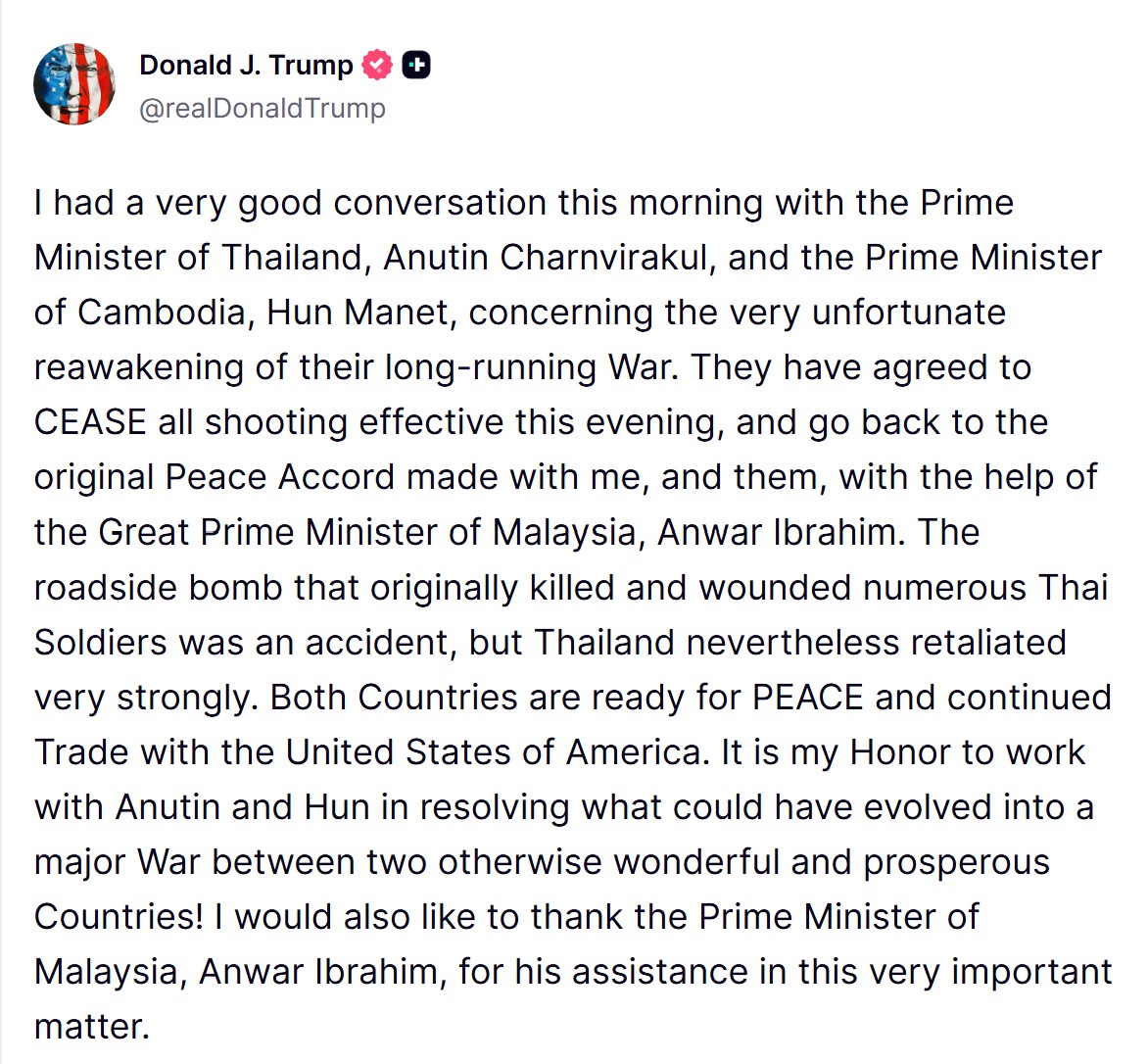 ทรัมป์โพสต์หลังคุยอนุทิน-ฮุน มาเนต อ้างไทย-กัมพูชา ตกลงจะยุติการสู้รบทั้งหมด และกลับสู่ปฏิญญาร่วม ชี้ทุ่นระเบิดที่คร่าชีวิตและทำทหารไทยบาดเจ็บเป็นอุบัติเหตุ แต่ฝ่ายไทยตอบโต้รุนแรง มั่นใจสองประเทศพร้อมสร้างสันติภาพและดำเนินการค้ากับสหรัฐฯ ต่อไป