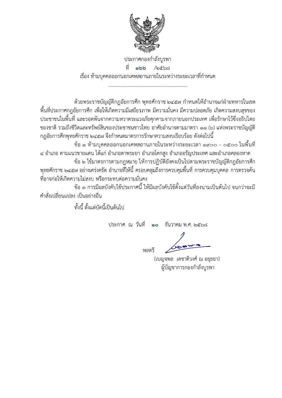 นอกจากนี้ ยังให้อำนาจเจ้าหน้าที่ทหารและฝ่ายความมั่นคงใช้มาตรการตามกฎหมายอย่างเคร่งครัด ทั้งการควบคุมพื้นที่ ควบคุมบุคคล และตรวจค้น เพื่อป้องกันเหตุที่อาจกระทบต่อความสงบเรียบร้อยและความมั่นคงของประเทศ โดยมาตรการดังกล่าวจะมีผลบังคับใช้จนกว่าจะมีคำสั่งเปลี่ยนแปลง